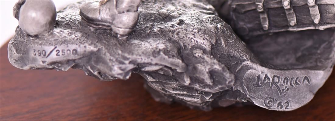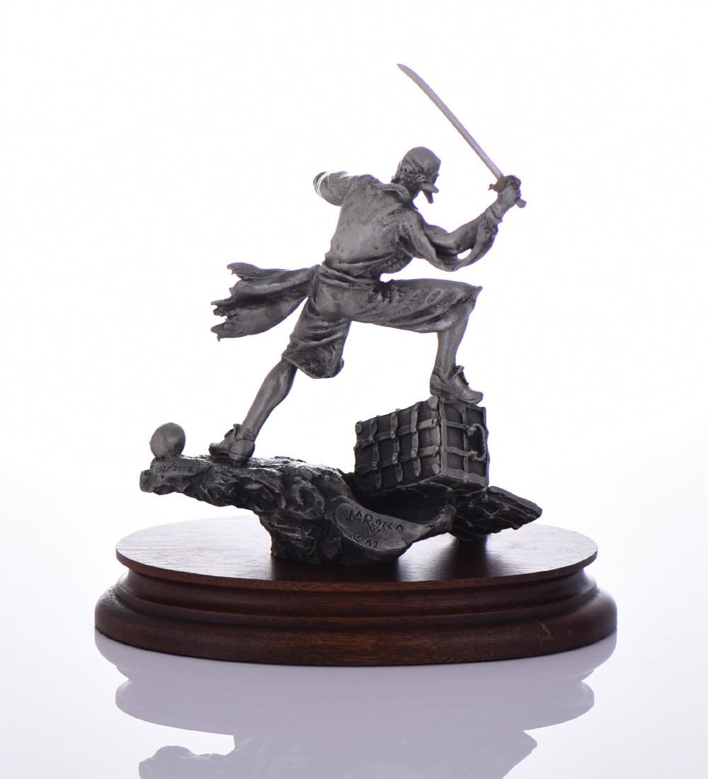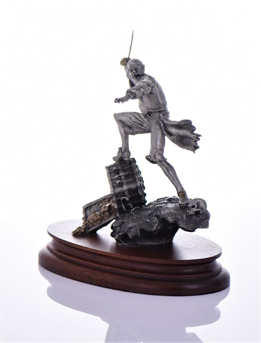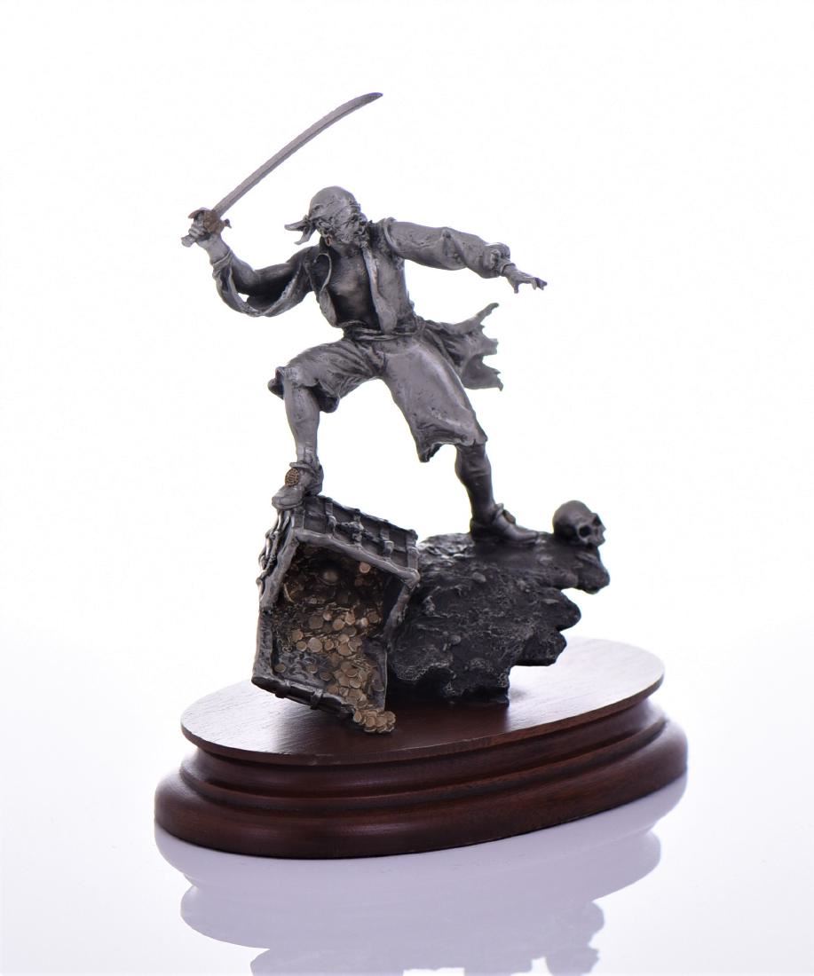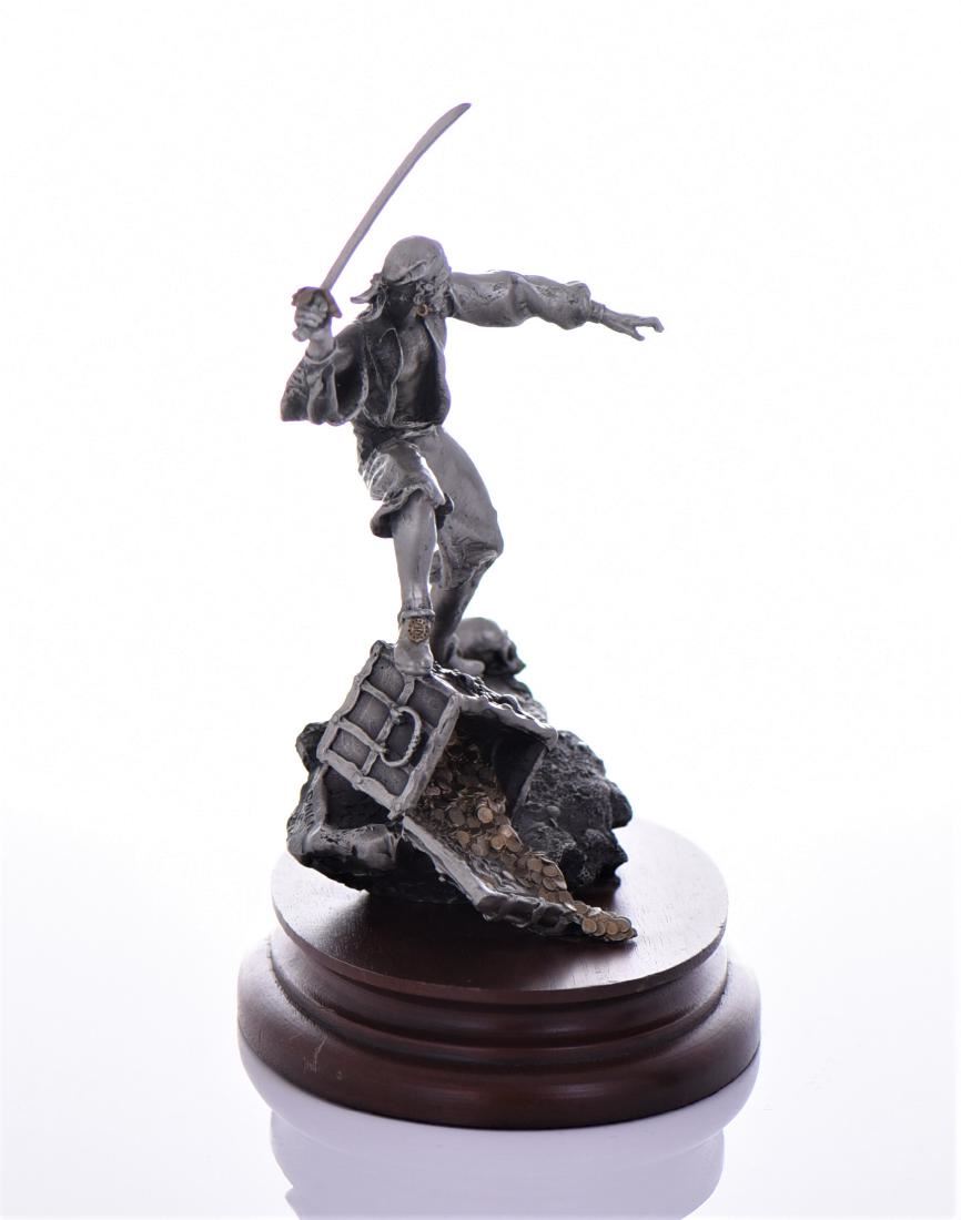 David LaRocca, 1982 Titled "Pieces Of Eight" Limited Edition 390 of 2500. Chilmark's Fine Pewter On Wood Base Pirate Art Sculpture. Estimated less than 50 yrs old. Pewter is a malleable metal alloy, traditionally 85 to 99 percent tin, with the remainder consisting of copper, antimony, bismuth and sometimes, less commonly today, lead. Silver is also sometimes used. Copper and antimony act as hardeners while lead is common in the lower grades of pewter, which have a bluish tint. It has a low melting point, around 338 to 446 deg F, depending on the exact mixture of metals. (Wikepedia) Size and/or Weight: See Measurement Photo. (Photos Represent The Lot Condition.)