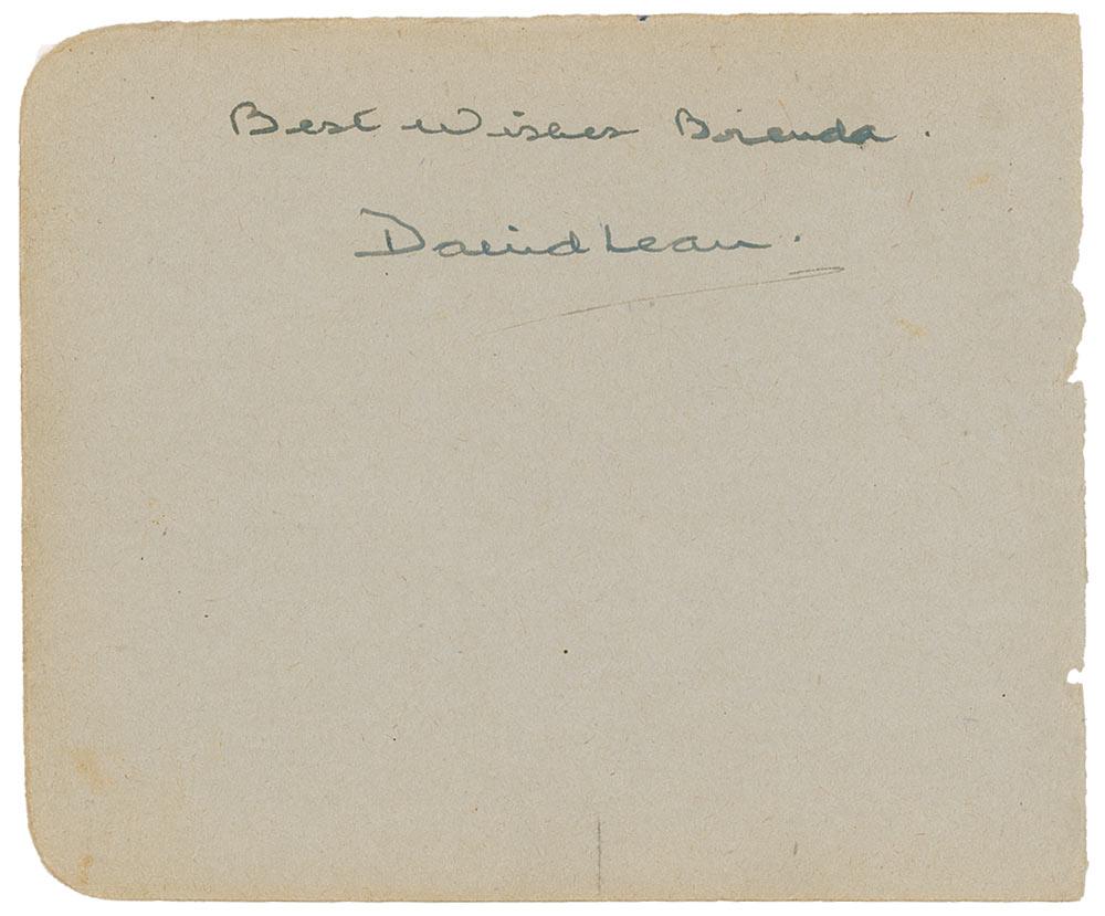Film director (1908–1991) best remembered for his adaptations of Charles Dickens’s novels, as well as epics such as The Bridge on the River Kwai and Lawrence of Arabia. Vintage fountain pen signature and inscription, “Best wishes Brenda, David Lean,” on an off-white 4.75 x 4 album page. In fine condition, with a few creases and scattered light toning.