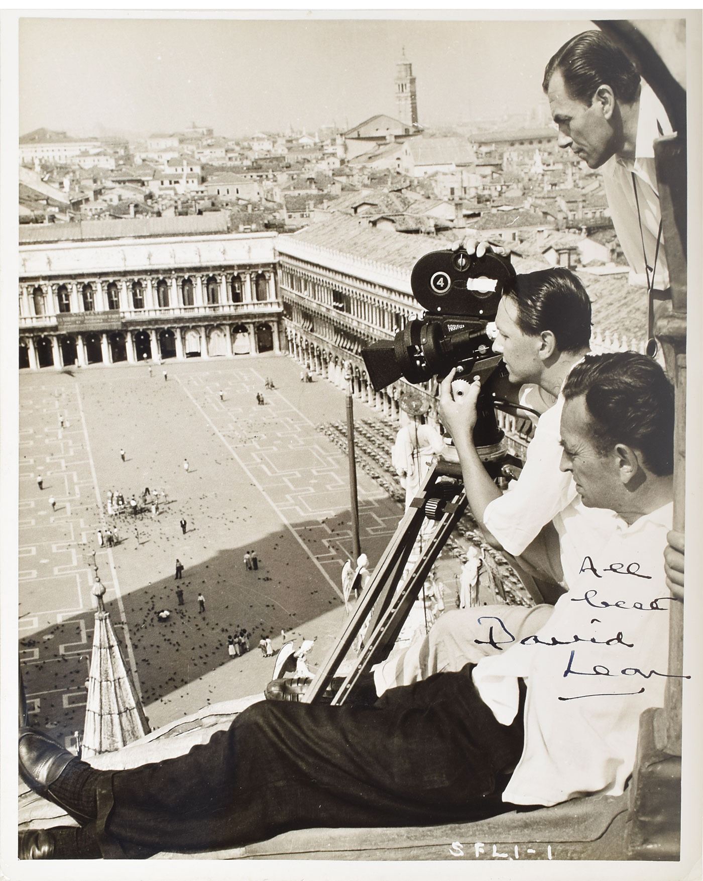 Glossy 8 x 10 photo of Lean filming from high above a courtyard, signed in black ink, "All best, David Lean." In fine condition, with a neatly trimmed top edge.