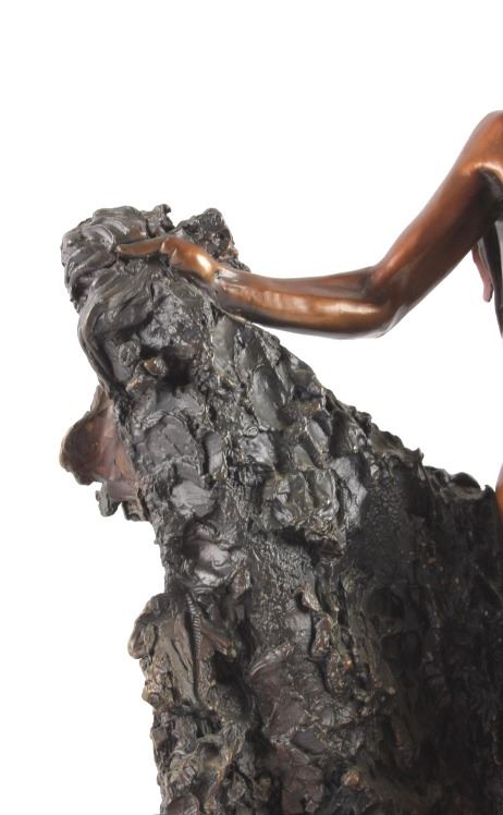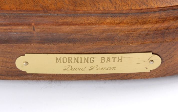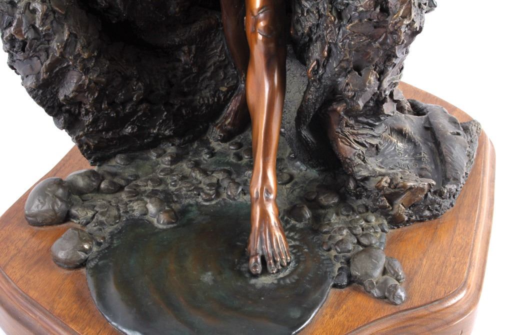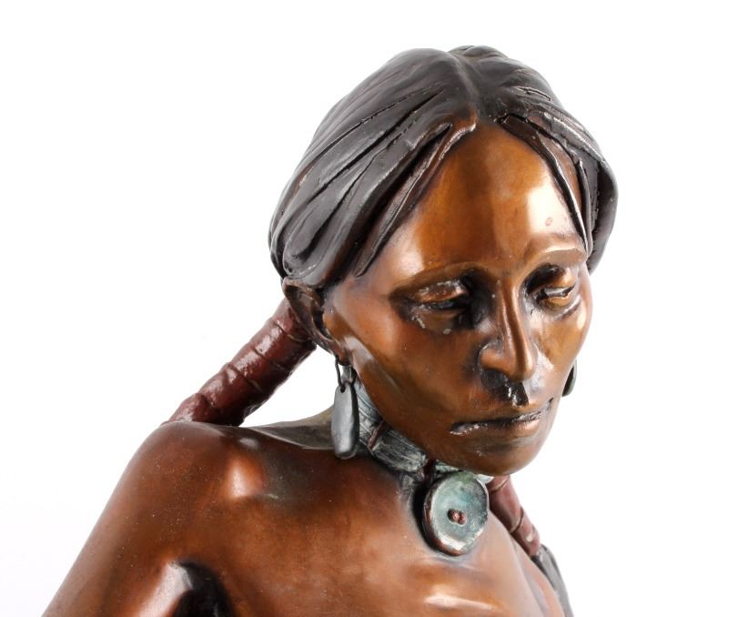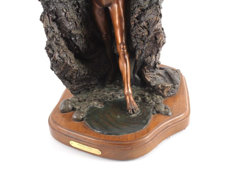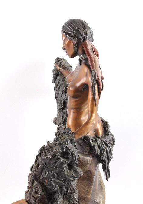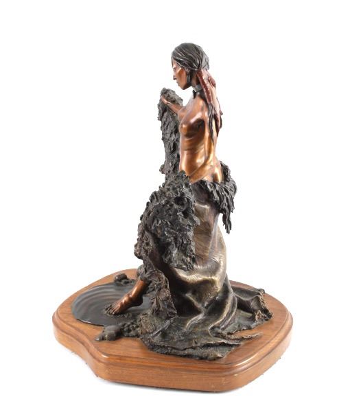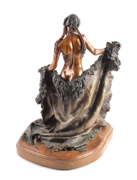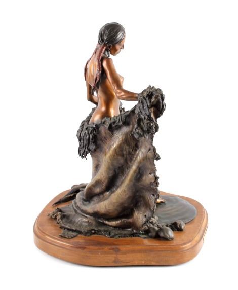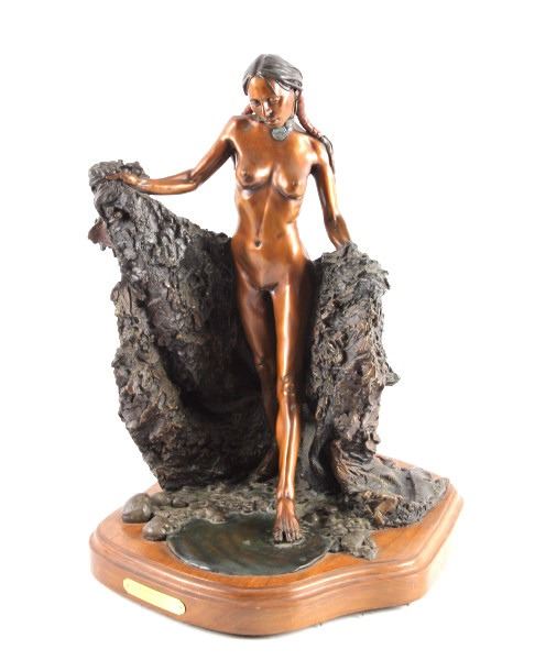 This is an original David Lemon Native American Indian nude bronze sculpture titled "Morning Bath". Born and raised in Ennis, Montana, Lemon has garnered international acclaim for his works. He is a member of the Gallup New Mexico Indian Artist's Group "Gathering of the Masters". His pieces have been showcased internationally as well as in the U.S. and Canada extensively. His work can be found in the collection of the Springville Art Museum in Springville, Utah and he has been featured in Southwest Art Magazine, Western Horseman Magazine and Art of the West Magazine. This bronze shows a beautiful Native American nude woman shedding her buffalo robe to bathe in the river. The piece shows wonderful detail and artistic talent. The bronze sits on a solid walnut hardwood base with a brass placard that reads "Morning Bath David Lemon". The sculpture has been signed by the artist and is numbered 1/30. The David Lemon bronze sculpture is in good condition. 15" x 17.5" and is 21.5' tall. This David Lemon Bronze was previously valued at over $6,000 with other examples of his work selling in excess of $16,000. This is a larger example than most.