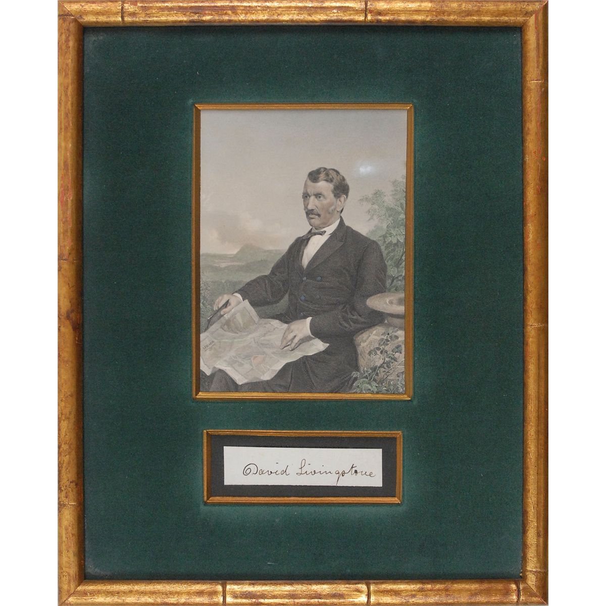 Scottish missionary and explorer (1813–1873) who ‘disappeared’ on an expedition to find the source of the Nile only to be famously rediscovered by Henry M. Stanley several years later. Ink signature, “David Livingstone,” on an off-white 4 x 1 clipped slip. Nicely suede-matted and framed with an engraved portrait to an overall size of 12 x 15. In fine condition, with closely trimmed edges affecting the downstroke of a single letter. Originally sold by Charles Hamilton, with his certificate of authenticity and wax seal affixed to reverse of frame.