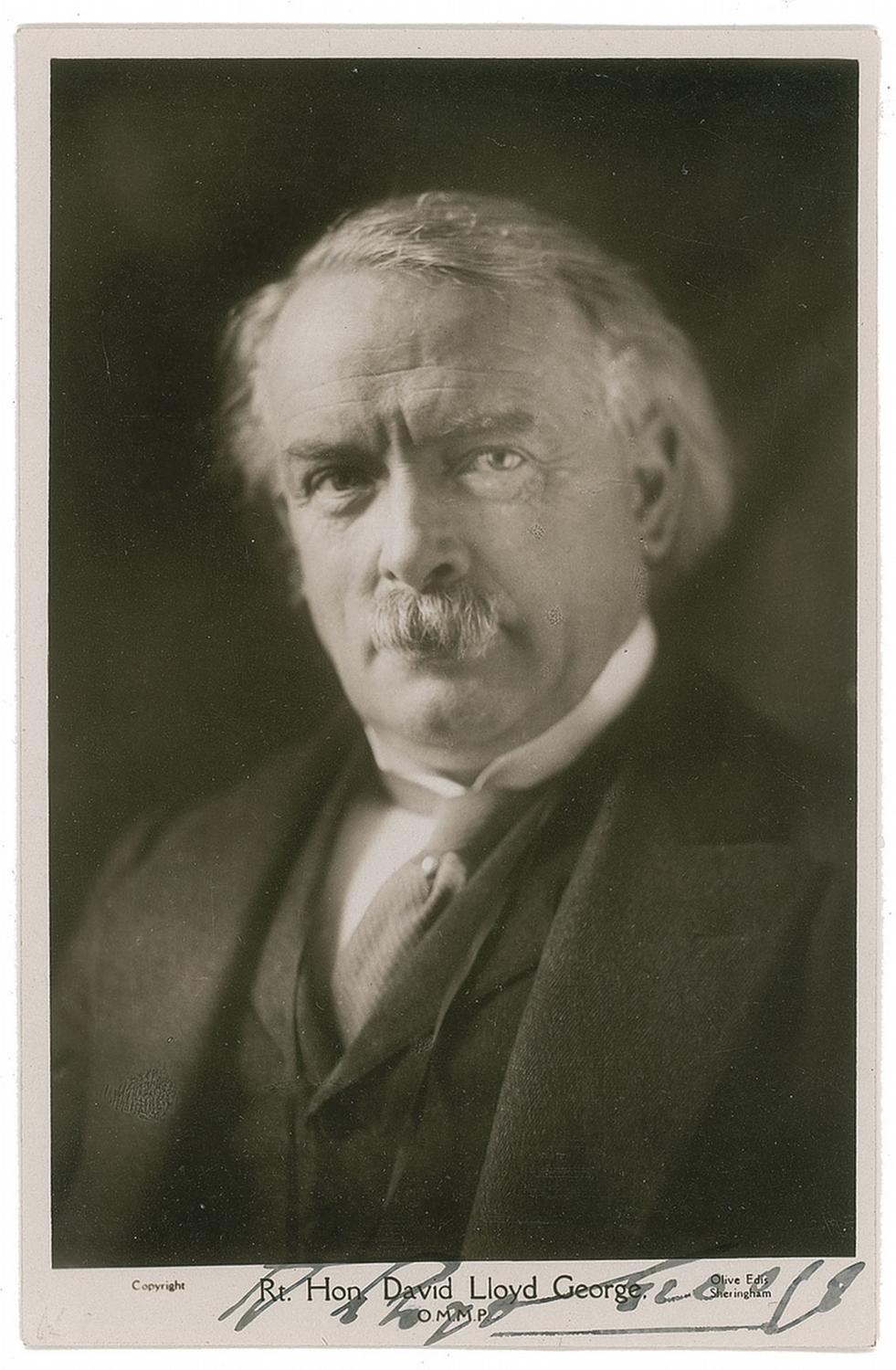 British statesman (1863-1945) and the only Welsh Prime Minister of the United Kingdom; he is also the only one to have spoken English as a second language, Welsh having been his first. Vintage 3.5 x 5.25 postcard photo, signed in the lower border in fountain pen “D. Lloyd-George.” A few small creases, a couple of surface scratches, spots of soiling, and silvering to the extreme edges, otherwise fine condition.