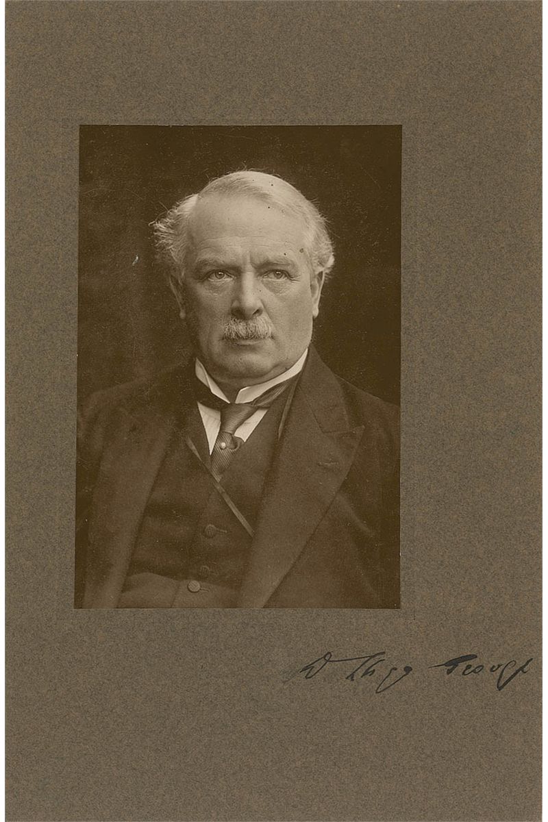 British statesman (1863-1945) and the only Welsh Prime Minister of the United Kingdom; he is also the only one to have spoken English as a second language, Welsh having been his first. Vintage glossy 4 x 6 photo, affixed to a 6.5 x 10 mount, signed in fountain pen on the mount, “D. Lloyd George.” In fine condition, with a rough left edge.