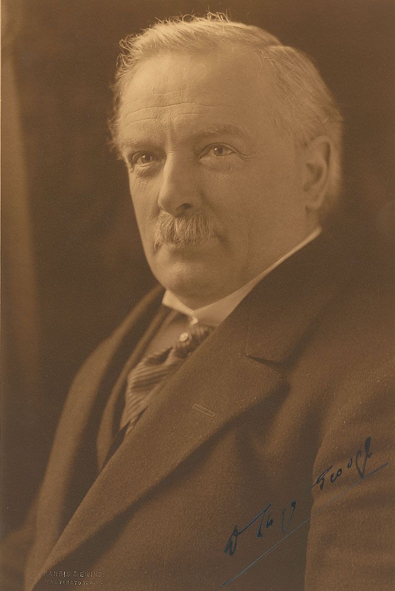 British statesman (1863–1945) and the only Welsh Prime Minister of the United Kingdom. Choice matte-finish 6 x 9 Harris and Ewing portrait of George in a stately pose, signed in fountain pen, “D. Lloyd George.” Blindstamped in the lower left by the renowned photography studio. Affixed by the top edge to a slightly larger mount. In fine condition. A magnificent image with deep, rich tones.