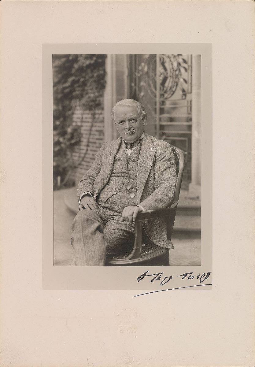 British statesman (1863–1945) who served as prime minister from 1916 to 1922, and who was a major player at the Paris Peace Conference of 1919, overseeing the decisions that determined Europe’s postwar future. Fantastic vintage matte-finish 9.5 x 13.5 seated portrait of the relaxed former prime minister by Wakefield Limited of Chiswick, signed in bold black ink, “D. Lloyd George.” In fine condition. Accompanied by its original photography folder.