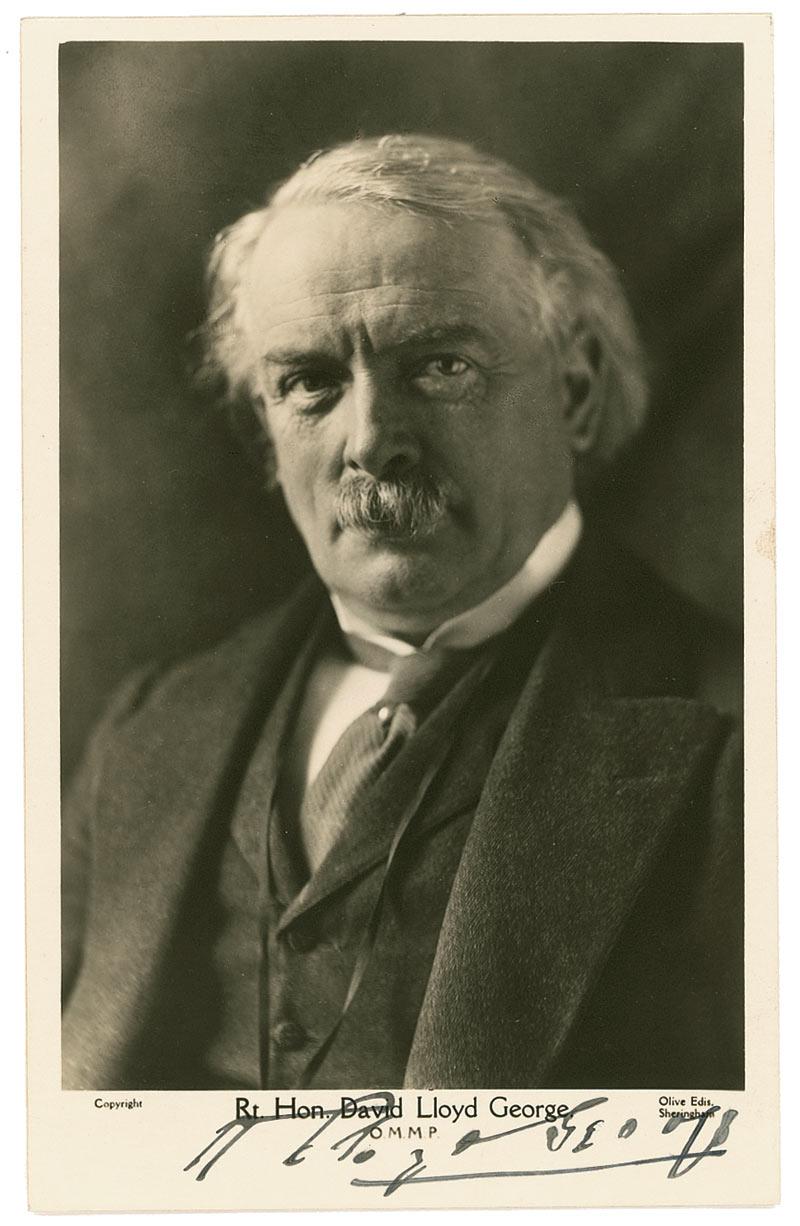 British statesman (1863-1945) and the only Welsh Prime Minister of the United Kingdom; he is also the only one to have spoken English as a second language, Welsh having been his first. Vintage 3.5 x 5.5 postcard photo, signed in the lower border in fountain pen. In fine condition. Provenance: The Barry Hoffman Collection.