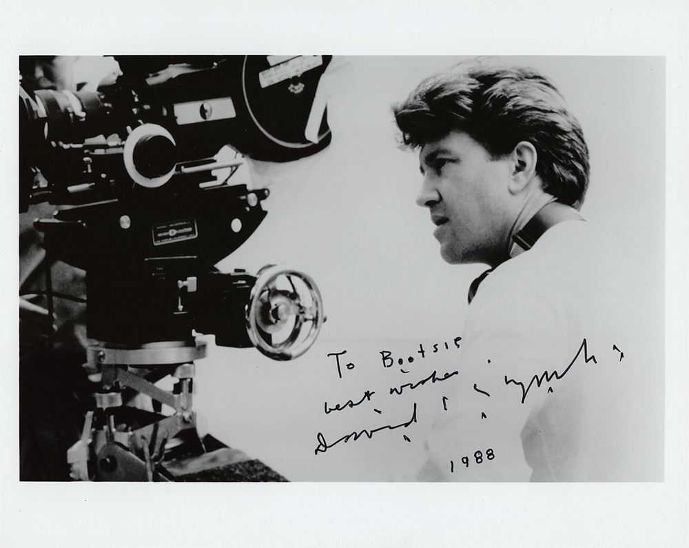 Glossy 10 x 8 photo of the influential film director pictured behind a movie camera early into his career, signed and inscribed in black felt tip, "To Bootsie, best wishes, David Lynch, 1988." In fine condition.