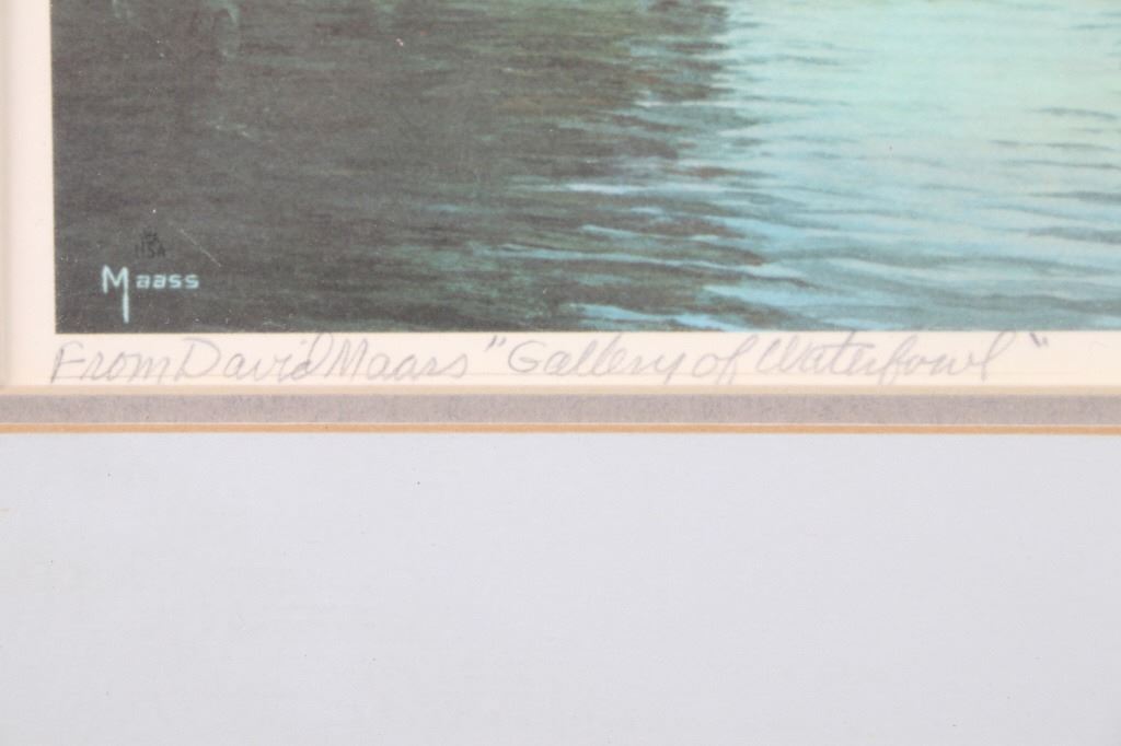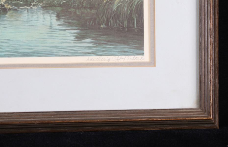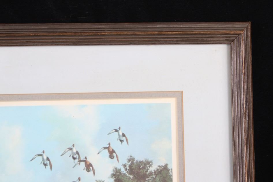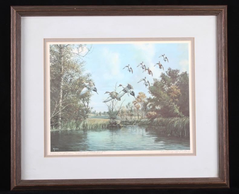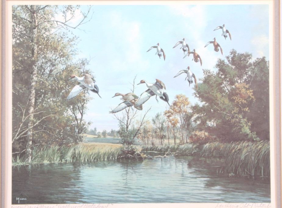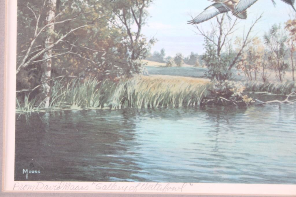Featured in this lot is this Lithograph called "Leveling off Pintail," by David Maass and from the Gallery of Waterfowl. This is a wonderfully and professionally crafted framed lithograph that features Pintails in flight above a pond and shows a wooded area in the distance. David Maass is known for Wildlife-waterfowl, illustrator. David Maass, essentially a self-taught wildlife illustrator, was born on November 27, 1929 in Rochester, Minnesota. As a youngster he rescued wounded birds and raised pigeons in his home. The condition of this framed lithograph is good with some wear tot he frame but otherwise is in good overall condition. The measurements of this framed lithograph are 13 1/8" x 15 1/2" x 8" x 10 1/4".