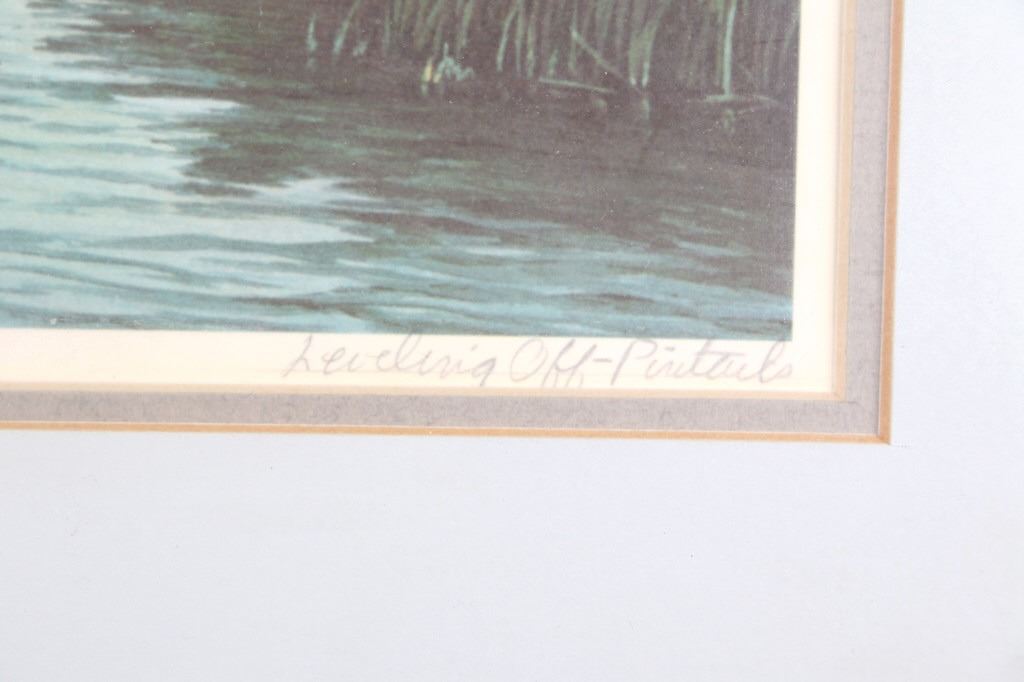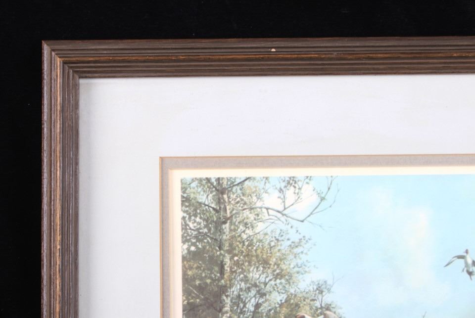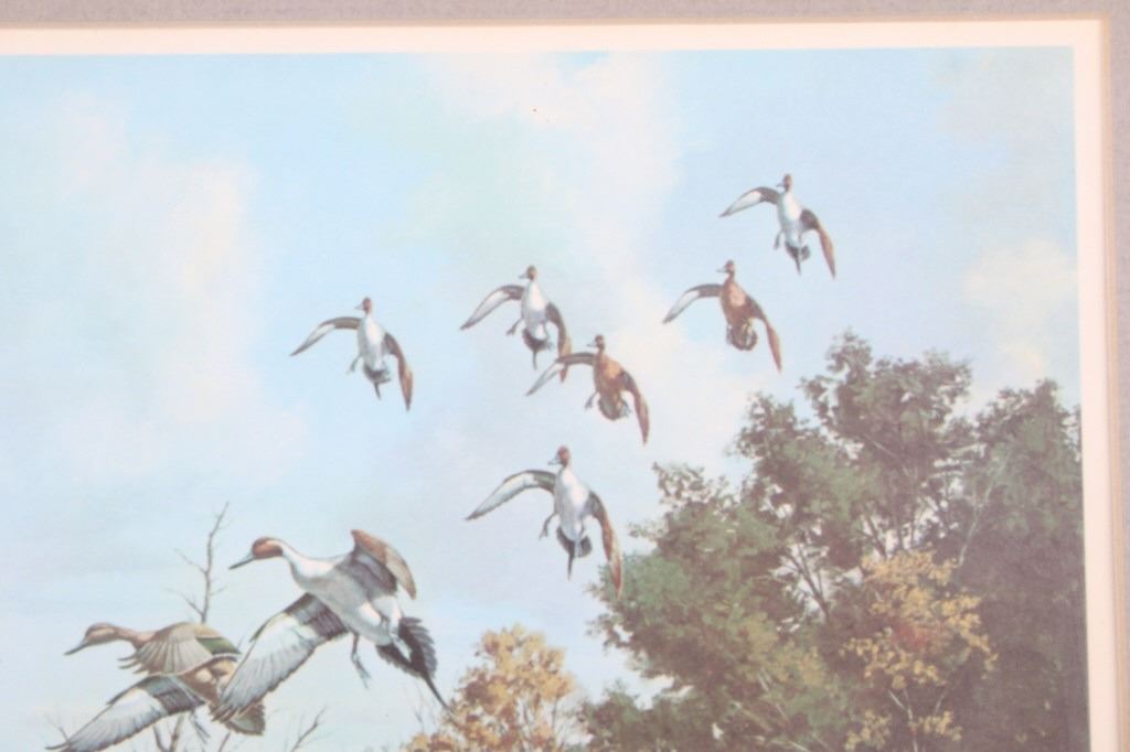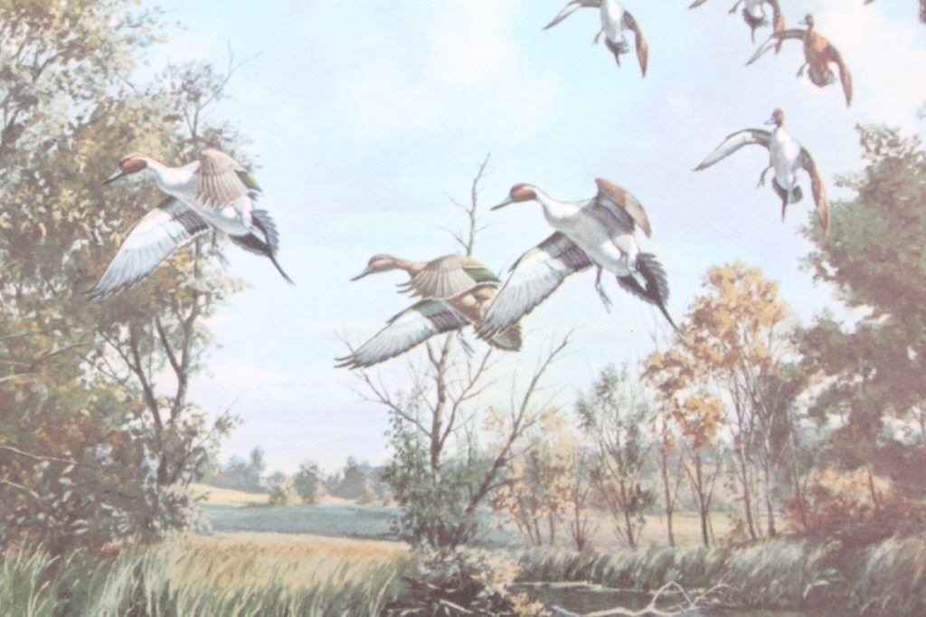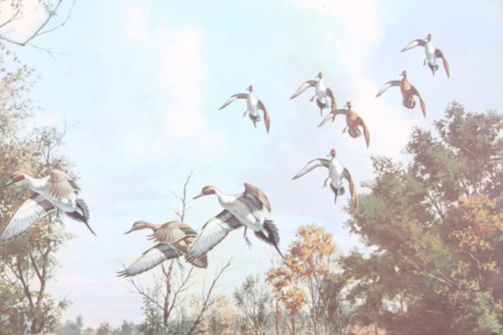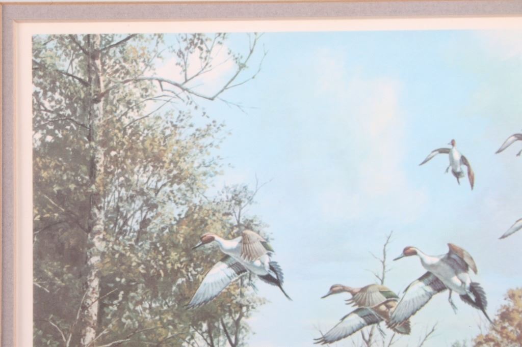 Featured in this lot is this Lithograph called "Leveling off Pintail," by David Maass and from the Gallery of Waterfowl. This is a wonderfully and professionally crafted framed lithograph that features Pintails in flight above a pond and shows a wooded area in the distance. David Maass is known for Wildlife-waterfowl, illustrator. David Maass, essentially a self-taught wildlife illustrator, was born on November 27, 1929 in Rochester, Minnesota. As a youngster he rescued wounded birds and raised pigeons in his home. The condition of this framed lithograph is good with some wear tot he frame but otherwise is in good overall condition. The measurements of this framed lithograph are 13 1/8" x 15 1/2" x 8" x 10 1/4".