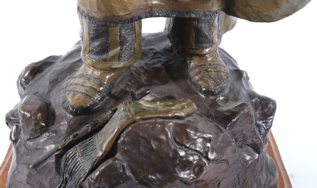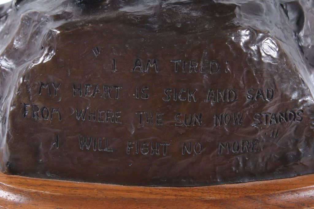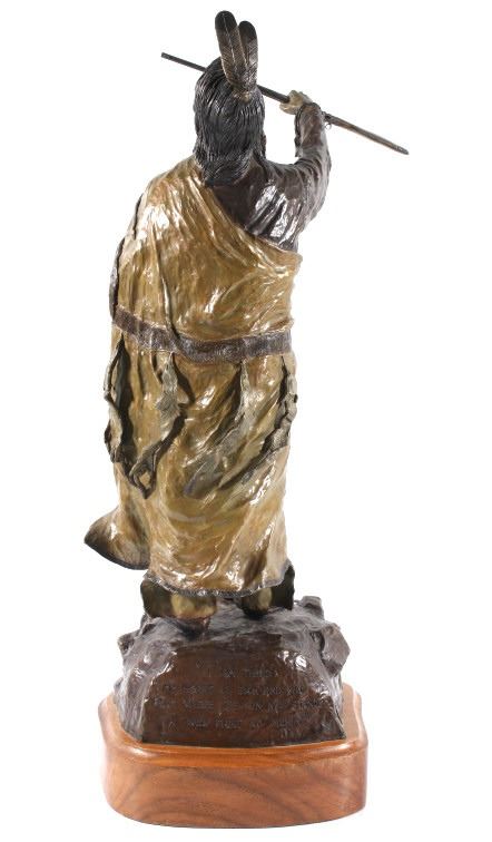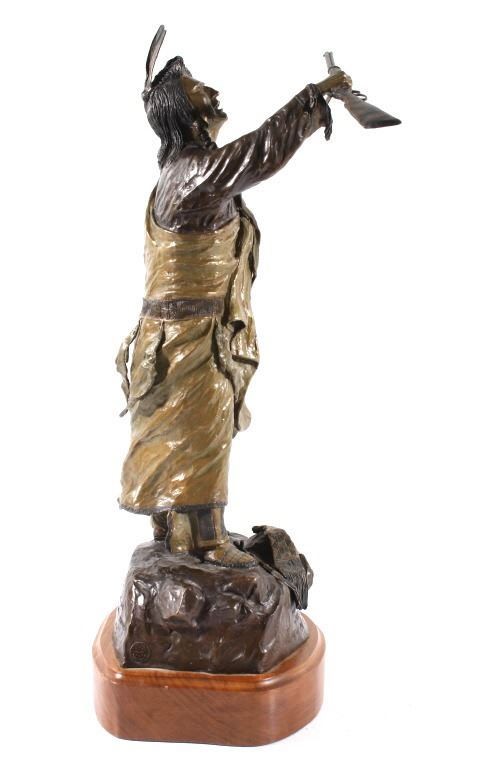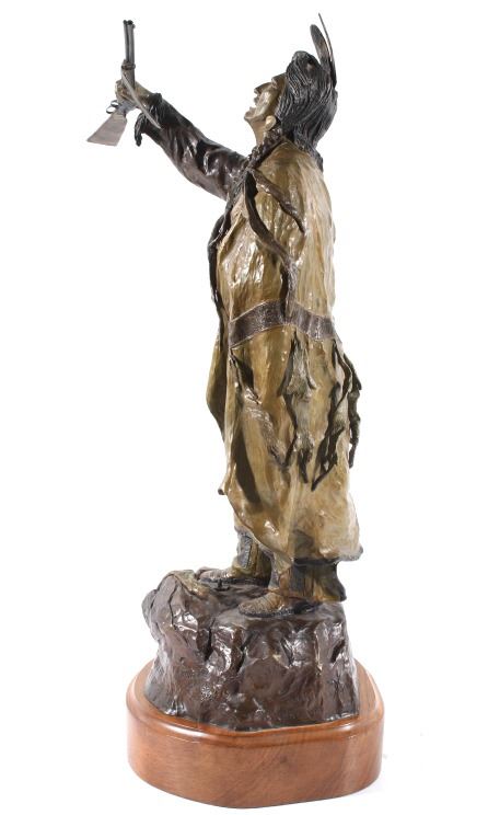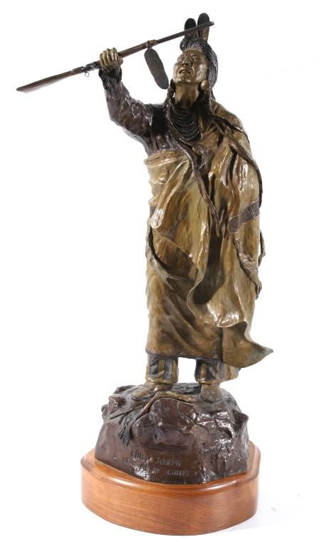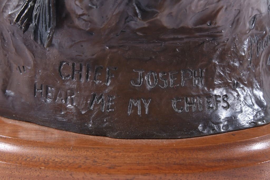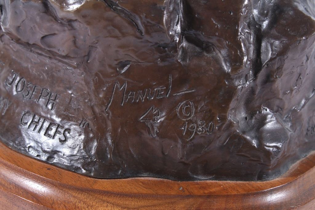Featured in this lot we have a limited edition David Manuel bronze sculpture of Chief Joseph dated 1980. David Manuel (b. 1940) is an American artist known for his bronze figural pieces and for his public work projects. Manuel focused is art on the issues around the American expansion, showing in his works of Native Americans, pioneers, and cowboys. This bronze depicts Native American leader Chief Joseph as he holds up his rifle to drop. The statue shows excellent attention to detail and strikes an impressive figure. The piece is marked across the front reading "Chief Joseph "Hear Me My Chiefs" Manuel c 1980". The side of the piece is marked with "Fred Mitchell c 1980 50/50" and shows a "Maiden Bronze Foundry" stamp on the other side. This limited edition statue is marked on the back with part of Chief Joseph's famous speech, reading "I Am Tired, My Heart is sick and sad from where the Sun now stands, I will fight no more.". The piece is set onto a custom made hardwood base with a brown felt bottom. The statue shows good condition overall with little to no wear. The piece measures 25" tall with the base measuring 9" wide and 8 3/4" deep. David Manuel artwork has become increasingly collectible with a piece of similar size that sold for $22,000 at a May 2019 sale at Heritage Auctions.