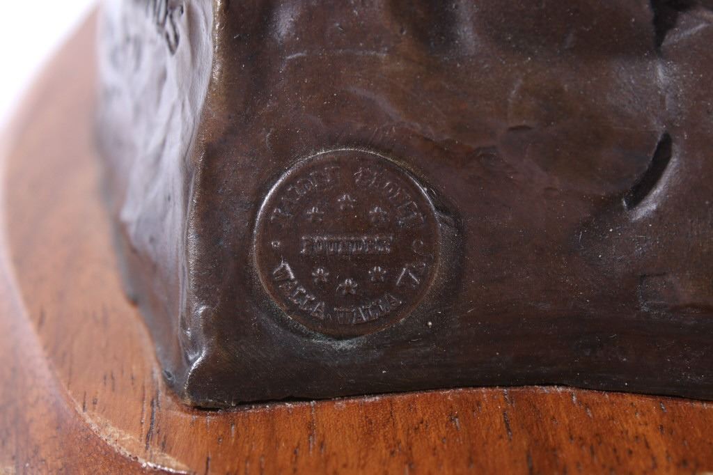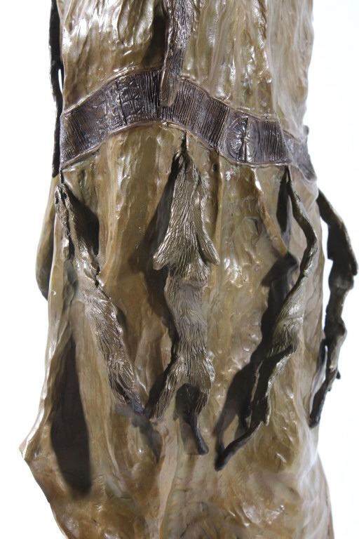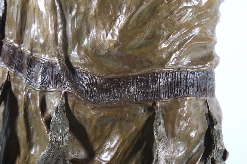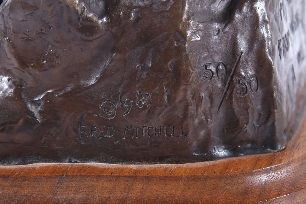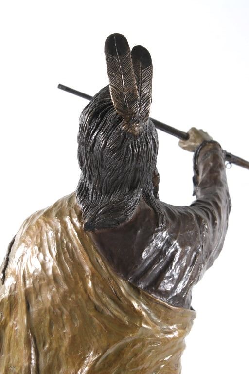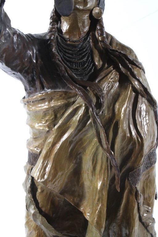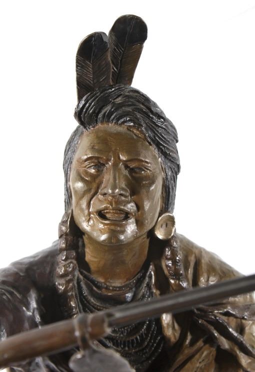 Featured in this lot we have a limited edition David Manuel bronze sculpture of Chief Joseph dated 1980. David Manuel (b. 1940) is an American artist known for his bronze figural pieces and for his public work projects. Manuel focused is art on the issues around the American expansion, showing in his works of Native Americans, pioneers, and cowboys. This bronze depicts Native American leader Chief Joseph as he holds up his rifle to drop. The statue shows excellent attention to detail and strikes an impressive figure. The piece is marked across the front reading "Chief Joseph "Hear Me My Chiefs" Manuel c 1980". The side of the piece is marked with "Fred Mitchell c 1980 50/50" and shows a "Maiden Bronze Foundry" stamp on the other side. This limited edition statue is marked on the back with part of Chief Joseph's famous speech, reading "I Am Tired, My Heart is sick and sad from where the Sun now stands, I will fight no more.". The piece is set onto a custom made hardwood base with a brown felt bottom. The statue shows good condition overall with little to no wear. The piece measures 25" tall with the base measuring 9" wide and 8 3/4" deep. David Manuel artwork has become increasingly collectible with a piece of similar size that sold for $22,000 at a May 2019 sale at Heritage Auctions.