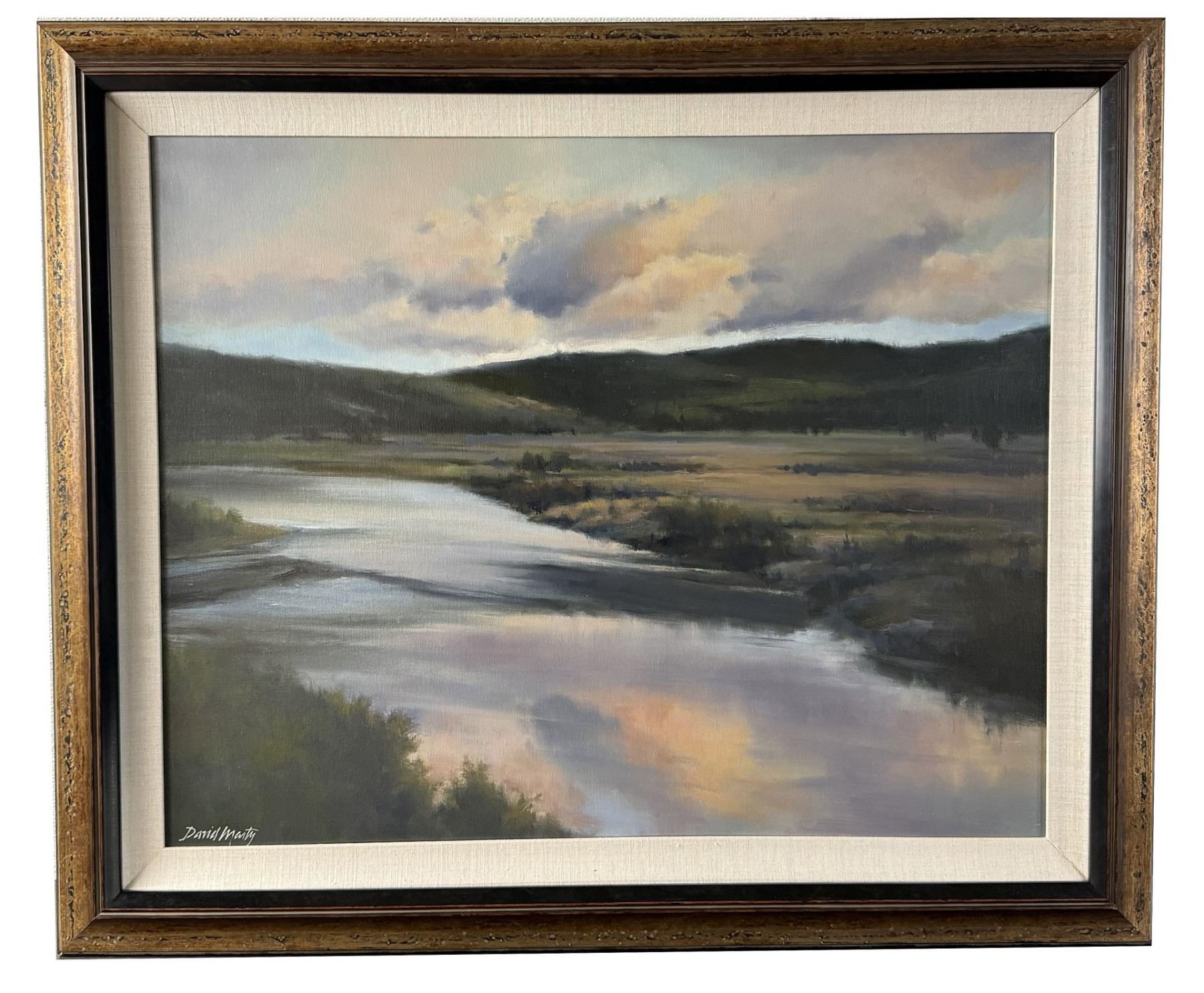 Title is Calm Evening. Oil on Canvas. 24" by 30" unframed, 31" by 37" framed. David Marty (Born 1951) is active/lives in Washington, California. David Marty is known for Luminous mountain landscape and skyscape painting, graphic design. One of the advantages of living in the Pacific Northwest is the spectacular scenery. I am often awestruck by the beauty, complexity and diversity that surround me. I see the fingerprints of a creative God everywhere, from the last glow of golden light on Mt. Rainier to the sparkle of a meandering meadow stream. This inspires me to attempt to capture the essence of a particular setting or a moment in time, and share that with others through my paintings. I like to use the effects of early morning or late afternoon lighting to bring out the more dramatic saturated colors and transform a seemingly ordinary setting. The challenge for me is to capture the patterns and contrasts between the warm light and cool shadows. I often try to isolate and focus in on scenes that others might normally overlook and give viewers a little different perspective. As long as I can remember I have wanted to be an artist. This has encompassed several different areas design, decorating, gardening, painting. My earlier landscapes were executed in a tight, almost photo-realistic manner. The turning point began after seeing the work of the French Impressionists in Paris. I was attracted by the brighter colors, freshness and spontaneity of their paintings. In recent years I have been drawn to the Russian and Early California Impressionists. While my work is still representational, I have loosened and softened my approach. By not defining every leaf or blade of grass, viewers have more opportunity to interact and use their imagination, making them a part of the creative process. David was born in northern California. He studied at Art Center College of Design, Biola University and the Scottsdale Artist´s School. Recently he has taken workshops with the Plein-Air Painters of America and Scott Christensen. David has spent the past 24 years in the Pacific Northwest. He and his wife, Jean reside in Edmonds and have five children, including two boys from Bulgaria.