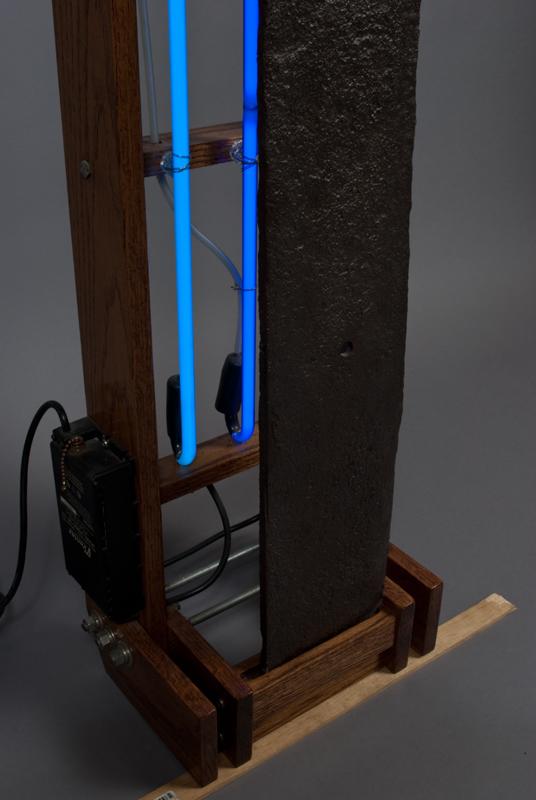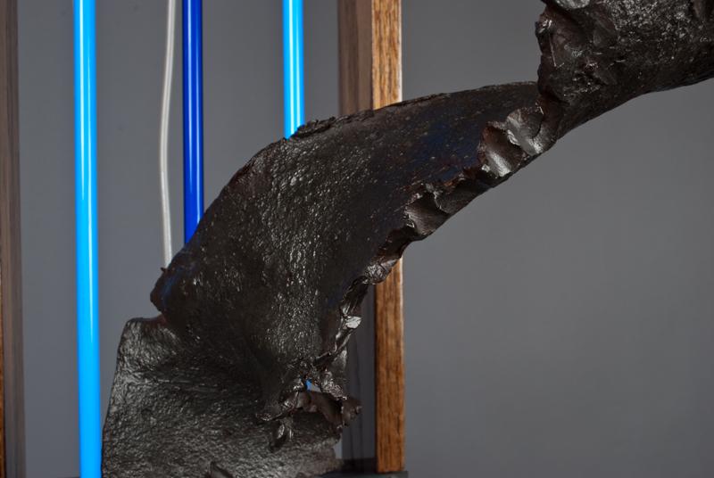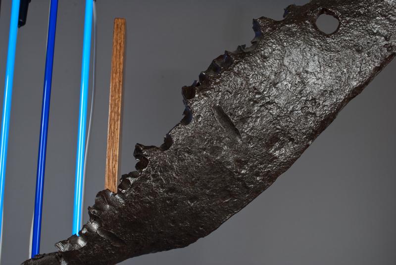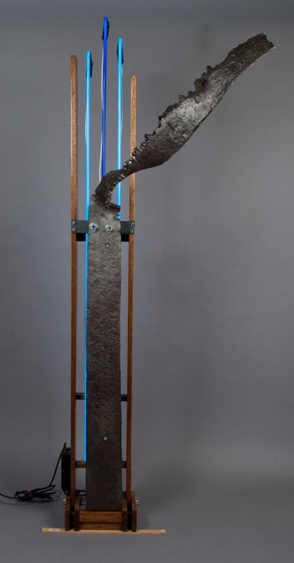 Large iron blade sculpture attached to wood with three variant blue neon lights. 82" H x 12" W x 28" D.