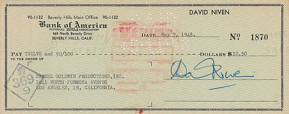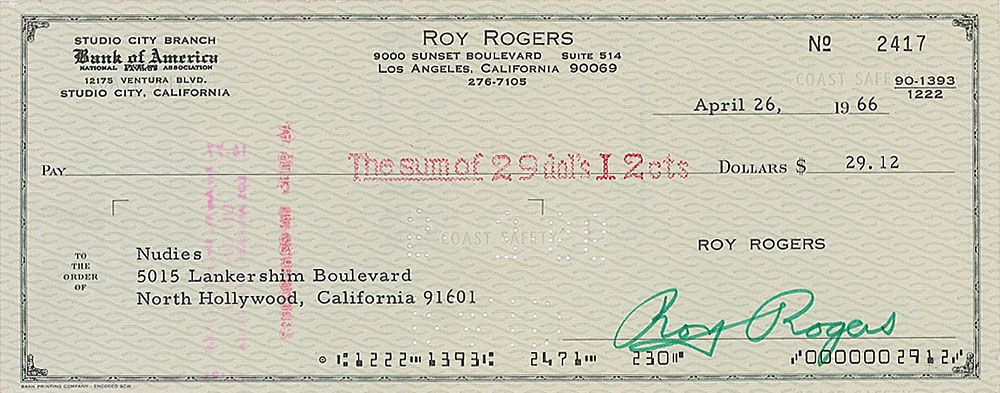 Two personal checks, both 8.5 x 3.25, and both filled out in type. One from 1948 payable to Samuel Goldwyn Productions, Inc., and signed by David Niven; and one from 1966 payable to Nudies, and signed by Roy Rogers. In fine condition, with expected stamps and holes, with show-through from one stamp lightly affecting beginning of Niven’s signature.