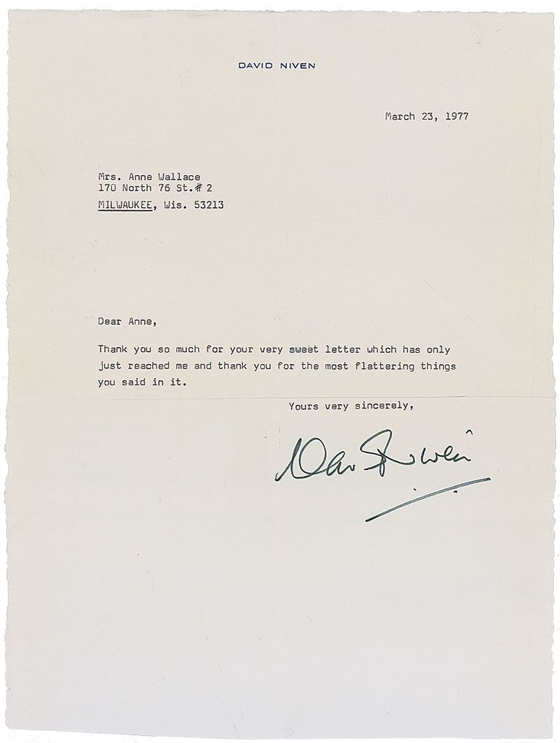 TLS, one page, 8.25 x 11, personal letterhead, March 23, 1977. Letter to an admirer. In full: “Thank you so much for your very sweet letter which has only just reached me and thank you for the most flattering things you said in it.” In fine condition, with central vertical and horizontal folds and slightly trimmed bottom edge.