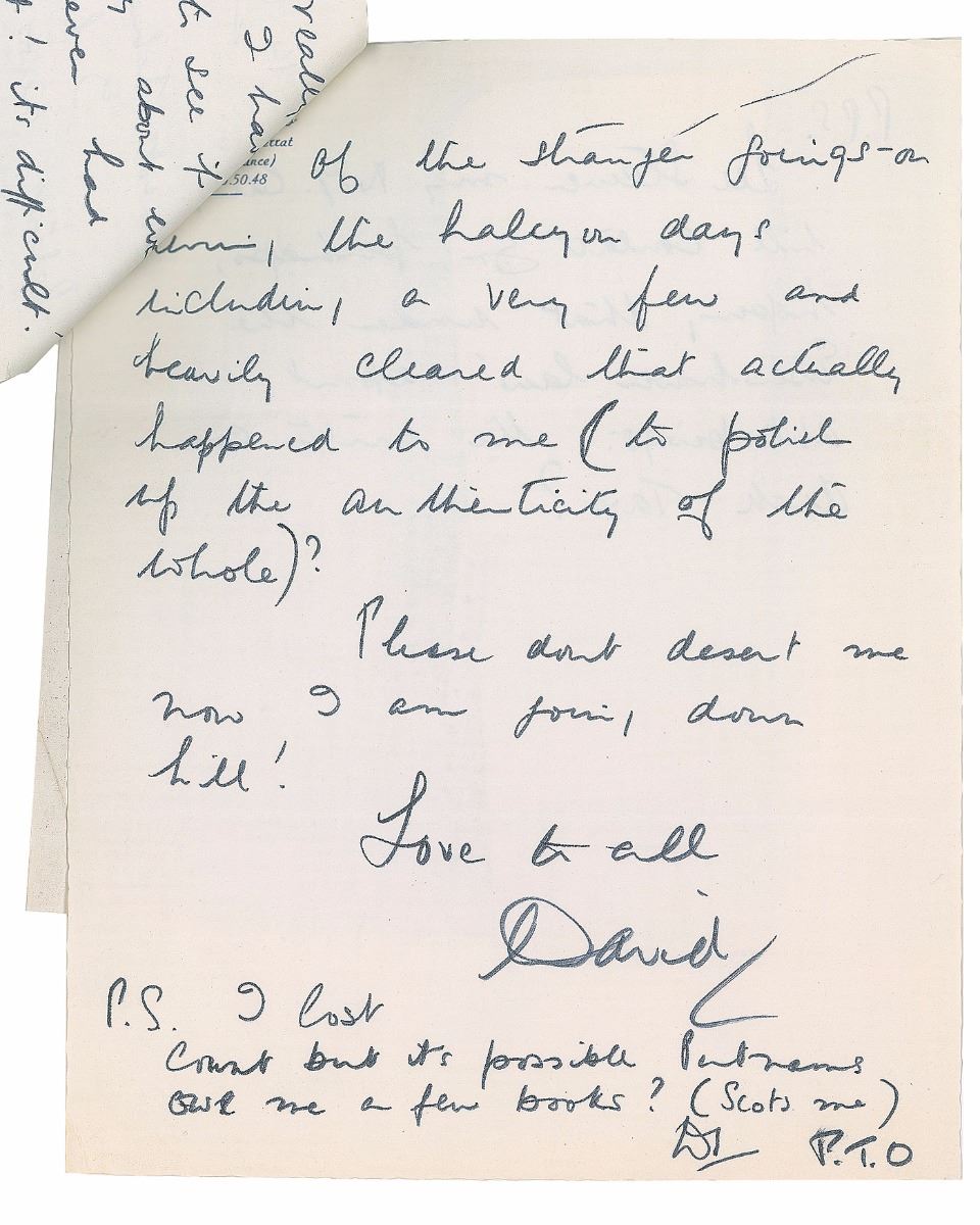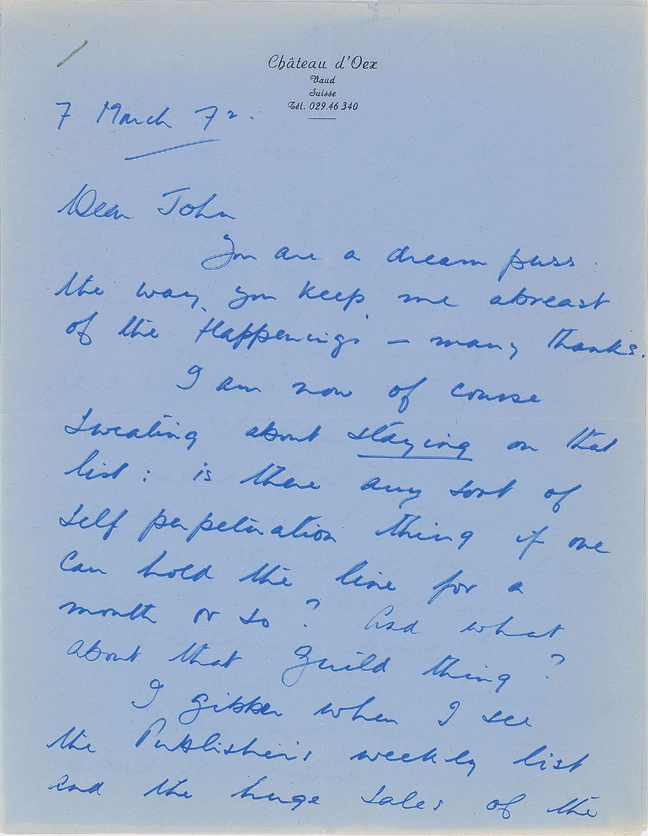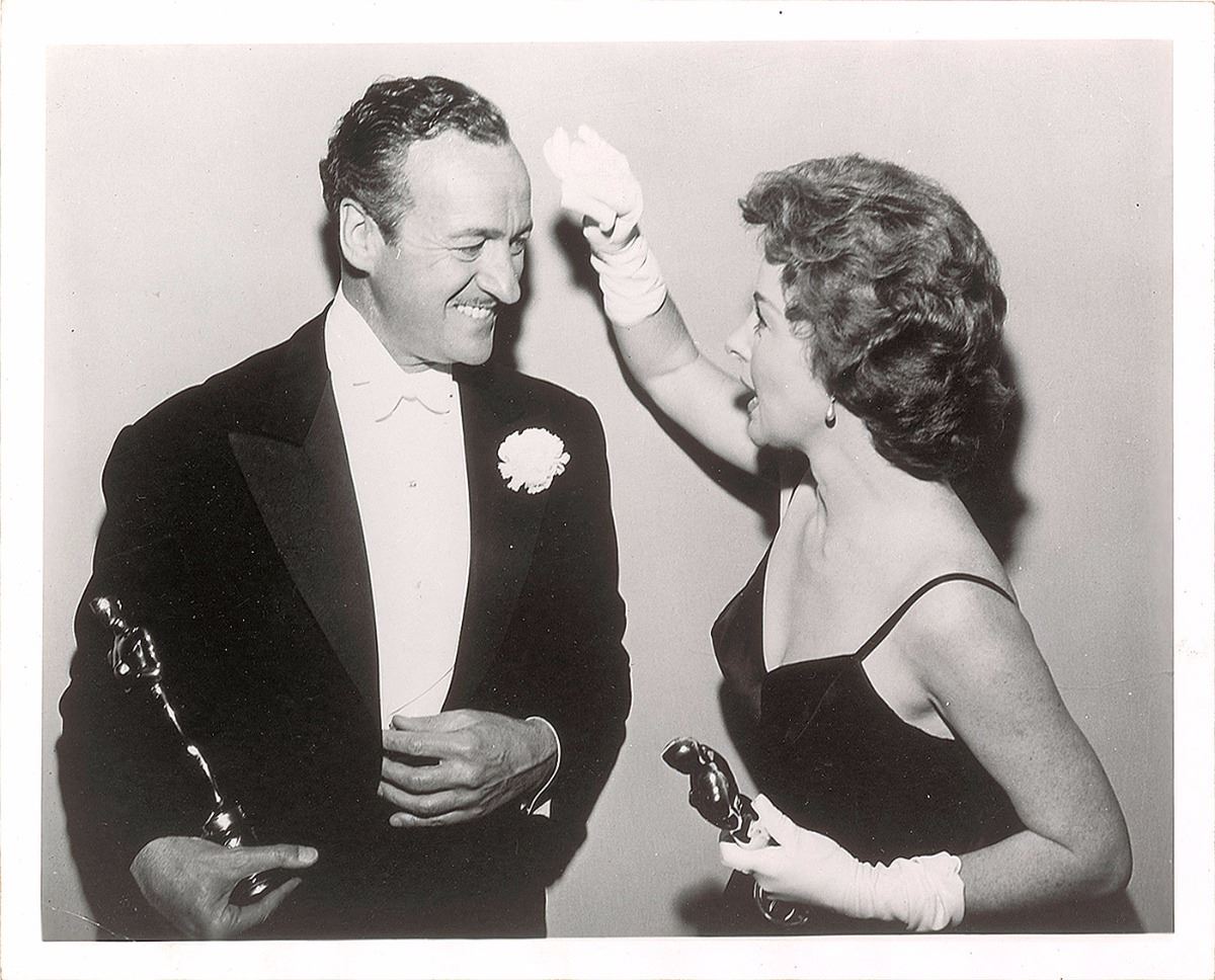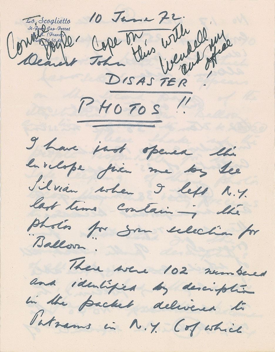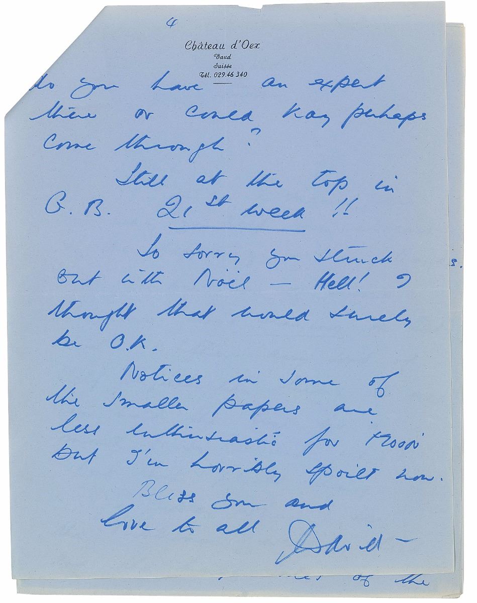 Interesting archive consisting of four lengthy ALSs, totaling eighteen pages on eleven sheets, dated March–June 1972. All concern the writing and publishing of his autobiography The Moon’s a Balloon and a book with the working title You Should Have Been in Pictures. One letter, in part: “I hope my efforts will pay off and keep the trusty Balloon flying high…I will, in a desultory way, keep on hacking away at the novel…But I certainly will start up on ‘You should have seen me in pictures.’ However, Research…Putnam’s surely has a list of broke freelance writers on the west coast who can check the gossip columns of those days? (For instance I was involved in the Rex Harrison–Carole Landis scandal but even so I cannot remember what went on publicly.) I was making a movie with Mary Astor too, when that scandal and all those names suddenly blazed forth…but I badly need a refresher course. I want ‘Pictures NOT to be dreary gossip and nostalgia, I want it to be fun, gay, sad sometimes, but above all I want to make the reader wish he HAD been in pictures at that time—a time now gone forever.” The other letters discuss photographs to be published in the books, reviews, and work in progress. Also includes seven glossy 8 x 10 press photos showing Niven throughout the course of his life. In overall fine condition.