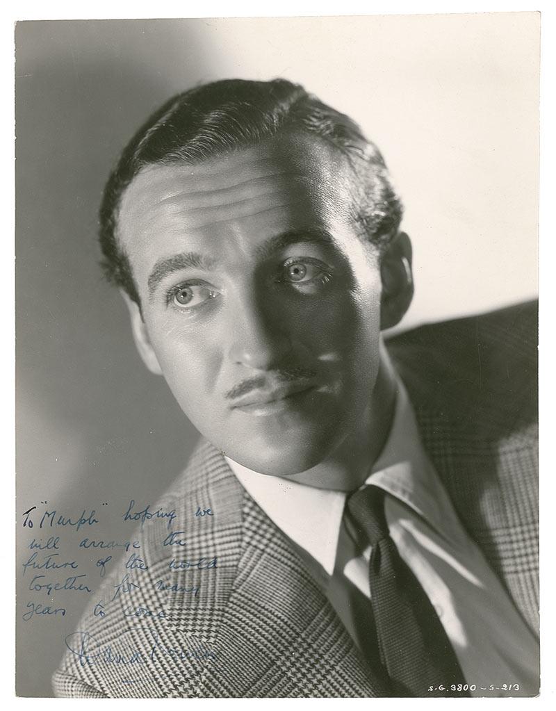 Dapper vintage glossy 7 x 9.25 photo, signed and inscribed in fountain pen “To ‘Murph’ hoping we will arrange the future of the world together for many years to come. David Niven.” In very good condition, with lightly trimmed edges, scattered light toning and creasing, and some light contrast to signature.