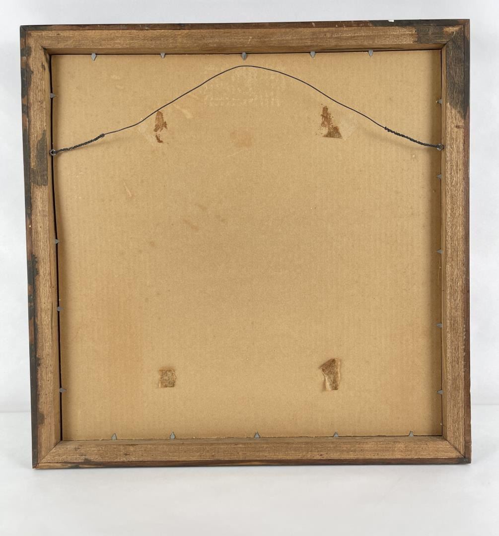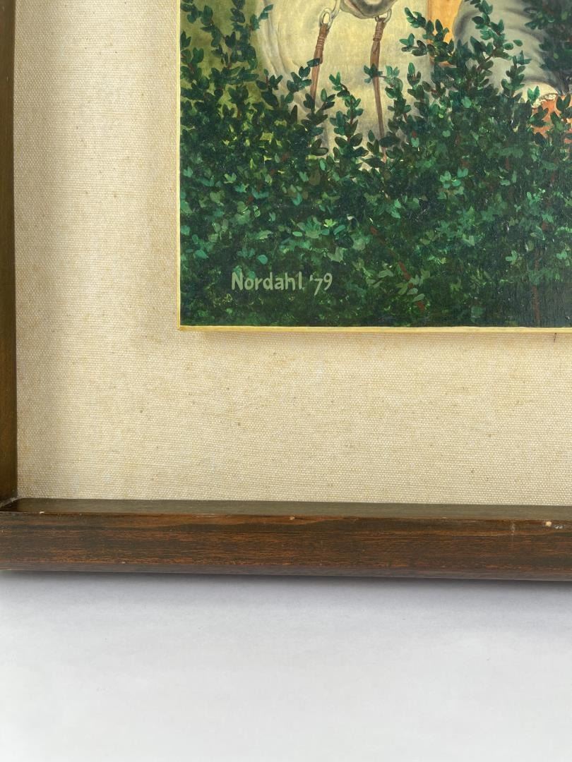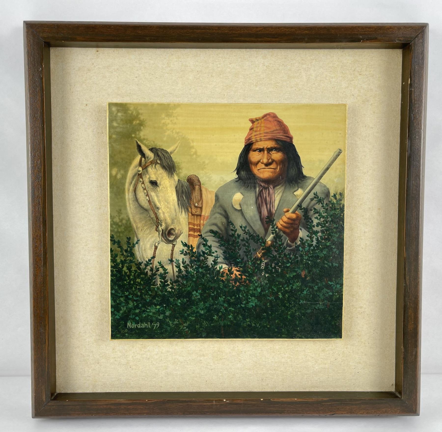 Title is Geronimo. 20" by 20" framed. David Nordahl (Born 1941) is active/lives in New Mexico, Minnesota. David Nordahl is known for Super real frontier-Indian genre painting. A painter in realist and luminist styles of 19th-century western frontier scenes, David Nordahl is especially interested in the culture of the Apache Indians and their confrontations with the United States military. He grew up as a farm boy in Minnesota, and by age 13 was earning money as an artist for his portraits of local townsfolk and for religious drawings. He also did silkscreen posters. Nordahl moved to Minneapolis where, with a friend, he established a business of doing murals, wall coverings and fabrics. However, in 1973, he sold out to devote himself to his western easel painting featuring Apaches. He and his wife, Lori, settled in Steamboat Springs, Colorado. However, he became flustered when he could find only a few books in the Denver library on the subject, so he decided to move to Santa Fe where he could be directly involved with the Apache Indians. His goal is to simply tell the story of the Apache people, a story that shows people especially vulnerable to white encroachment because they lived in small, often separated bands of 20 to 30 persons. The only surviving photographs he has found of them are from the reservation days when they were in captivity and not in their natural environment. Nordahl became so knowledgeable about them that he has served as an authenticator of Apache clothing and other items for persons who are interested in them. In the late 1980s, Nordahl suspended his Indian painting to do special commission work such as theme-park designs and special projects with Stephen Spielberg and for Michael Jackson, for whom he illustrated a book. About 2000, Nordahl returned to his Indian painting, focusing more on male figures and dramatic lighting effects. His wife, Lori, trains quarter horses for competitions, and the couple has three grown children.