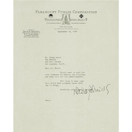 <B>David O. Selznick Signed Document.</B></I> The offspring of a film-producing family, David O. Selznick was one of the forerunners of the modern independent producer. As a studio executive during the first half of the 1930s, he was responsible for the making of such classics as "King Kong" and "A Tale of Two Cities." As an independent producer from 1936 to 1957, Selznick made a small but substantial body of dramas, comedies, and thrillers, 18 in all, many of which are cited among the best films of their era in their respective genres. Featured is a thank you letter from Selznick to reporter Jimmy Starr, dated September 25, 1930, and signed by the movie mogul in bold script. The letter is matted and framed along with a photo of Selznick sitting in front of a portrait of Vivien Leigh as Scarlett O'Hara in "Gone With the Wind," which earned him an Oscar for Best Picture. A great collector's item. <I>With COA from PSA/DNA.</B></I>