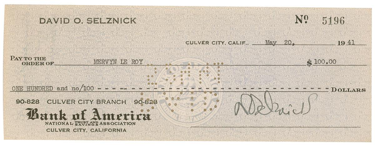 Pioneering film producer (1902–1965) who became one of the most powerful men in Hollywood. Among his greatest triumphs were the consecutive Best Picture winners Gone With the Wind and Rebecca. Personal check, 8.25 x 3, filled out in type and signed by Selznick, payable to Mervyn LeRoy for $100.00, May 20, 1941. Reverse bears a secretarial endorsement. A central vertical fold, cancellation holes to body, and some mild edge toning, otherwise fine condition. Excellent association between two of Hollywood’s biggest names.
