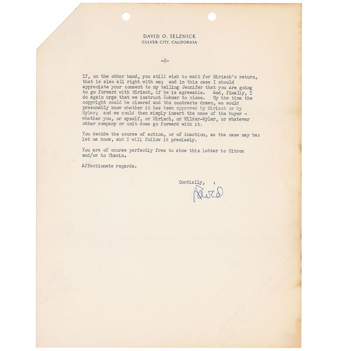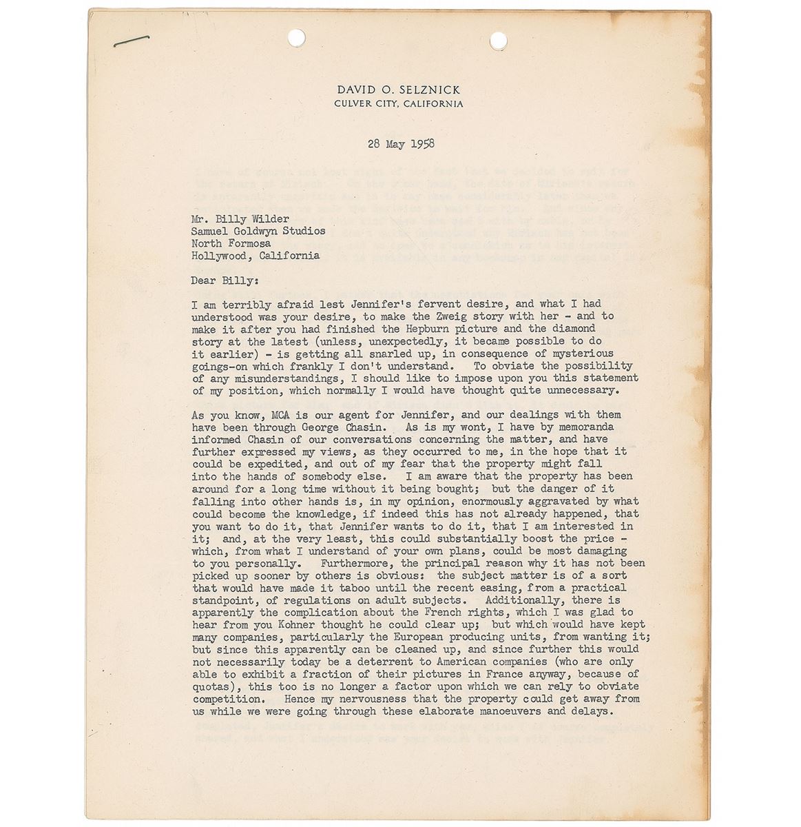 TLS signed “David,” five pages, 8.5 x 11, personal letterhead, May 28, 1958. Fantastic letter to director Billy Wilder. In part: “I am terribly afraid lest Jennifer’s fervent desire, and what I had understood was your desire, to make the Zweig story with her—and to make it after you had finished the Hepburn picture and the diamond story at the latest (unless, unexpectedly, it became possible to do it earlier)—is getting all snarled up, in consequence of mysterious goings-on which frankly I don’t understand…The principal reason why it has not been picked up sooner by others is obvious: the subject matter is of a sort that would have made it taboo until the recent easing, from a practical standpoint, of regulations on adult subjects…Hence my nervousness that the property could get away from us while we were going through these elaborate maneuvers and delays.” Dampstaining to right edge, otherwise fine condition.