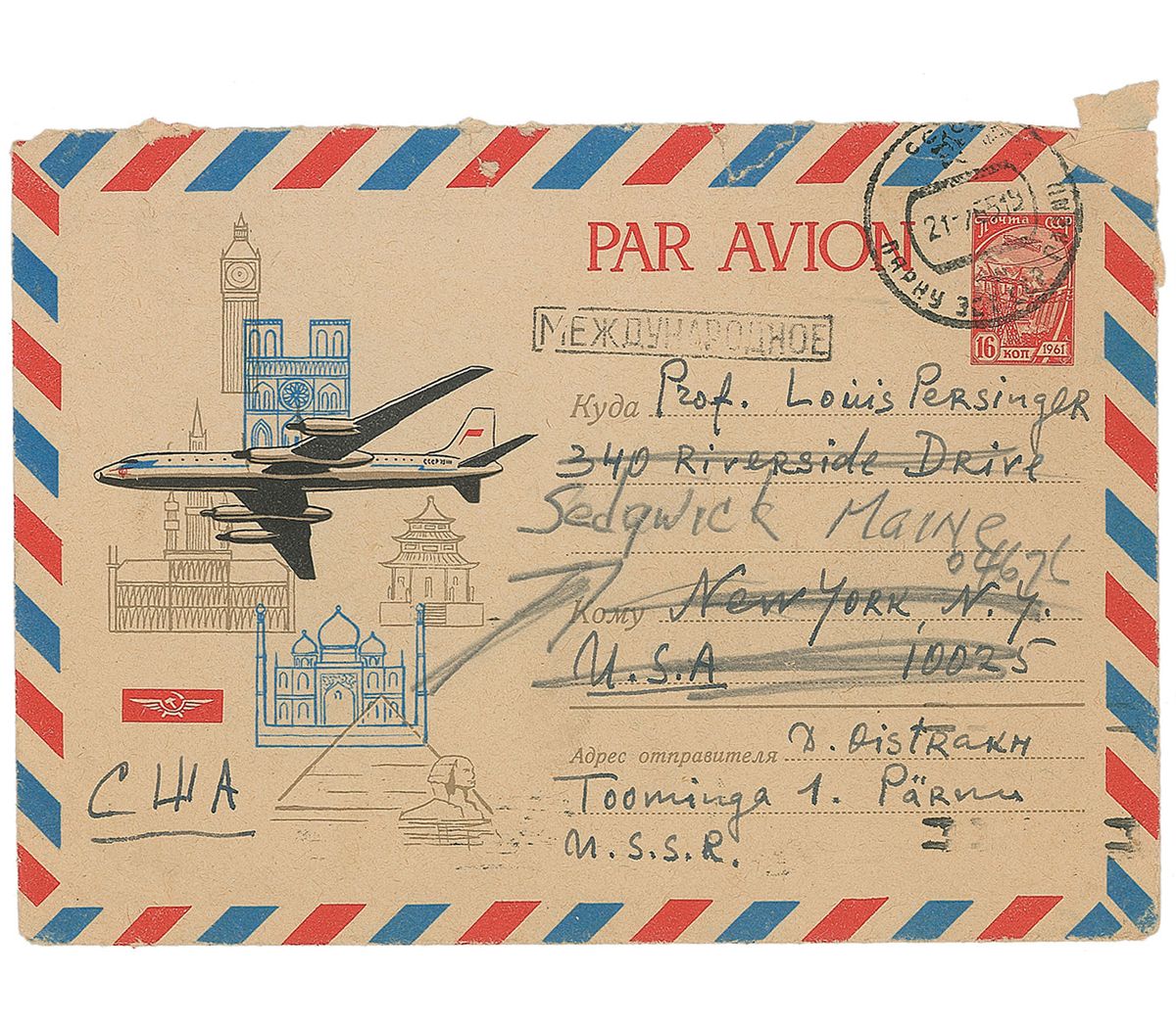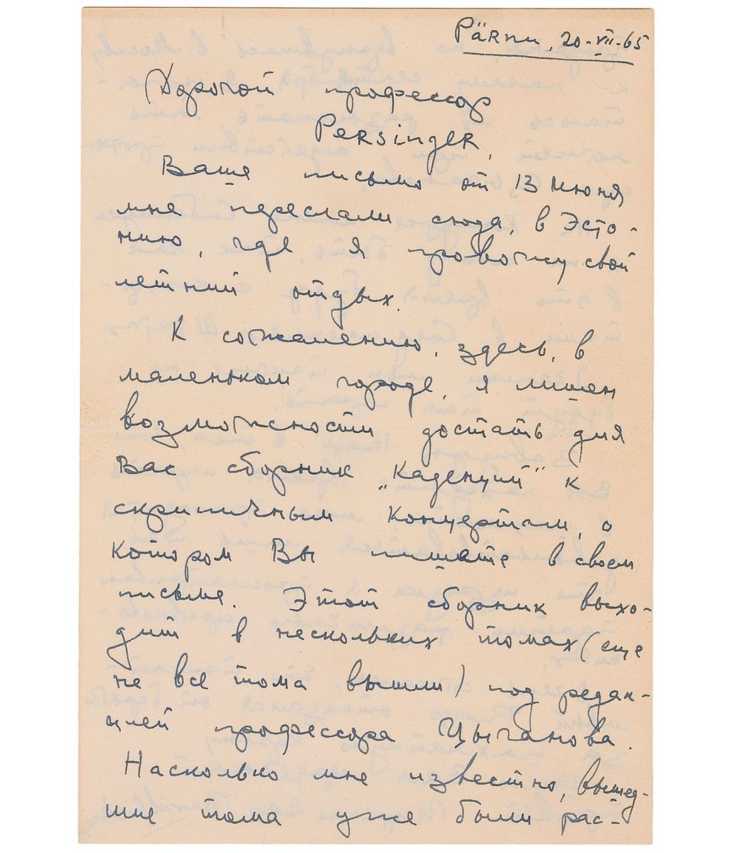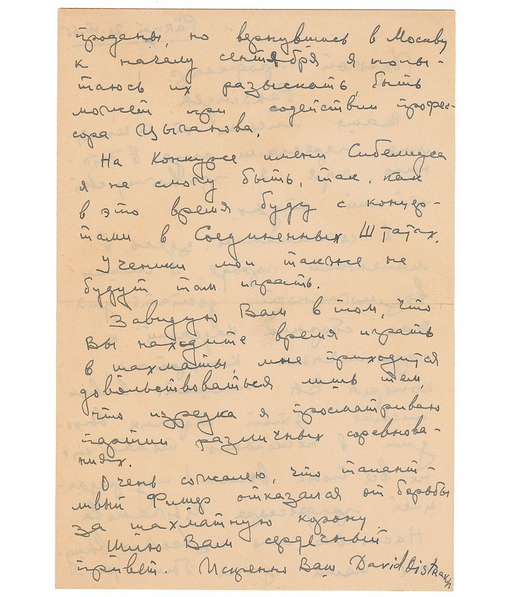 Russian violin virtuoso (1908–1974). ALS in Russian, one page both sides, 5.5 x 8, July 20, 1965. Untranslated letter to Louis Persinger. In fine condition. Accompanied by the original mailing envelope, addressed in Oistrakh’s hand. Originates from the collection of American violinist and pianist Louis Persinger (1887–1966), who trained at the Leipzig Conservatory and later taught at Juilliard, mentoring the likes of Yehudi Menuhin, Ruggiero Ricci, and Isaac Stern.