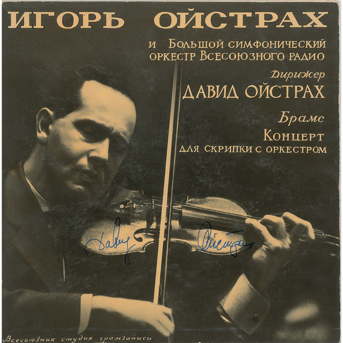 Russian violin virtuoso (1908–1974). Russian release of Brahm's Violin Concerto in D major op. 77, performed by Igor Oistrakh and conducted by his father David, signed on the front cover in blue felt tip by David Oistrakh. In fine condition, with some light rubbing and wear to cover and a small separation along spine. The record is included.