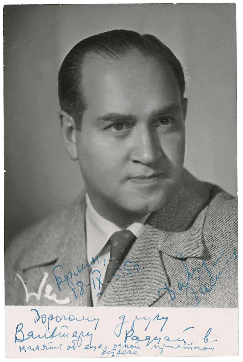 Russian violin virtuoso (1908-1974). Vintage glossy 4.75 x 7.25 head-and-shoulders photo, signed and inscribed in blue ink in Russian and dated September 18, 1955. Scattered light creases and surface marks, otherwise fine condition.