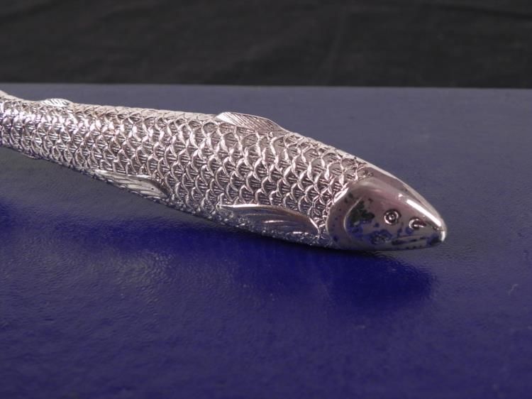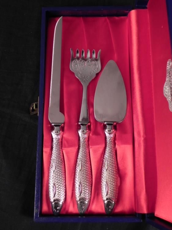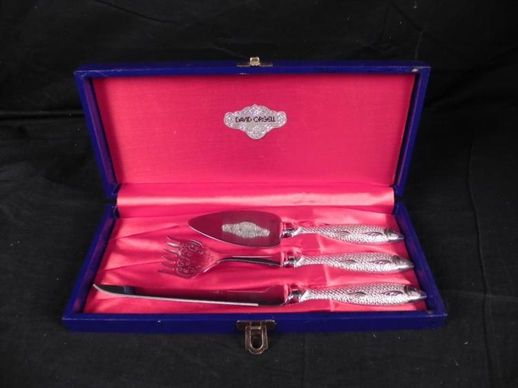 This is a vintage 3 piece set of fish serving utensils by David Orgell. Each has a handle like a fish, with nice detail. All are very good condition with light wear. The sizes are from 7" to 9 3/4". They come in the origional hinged box with latch, and red silken lining. * These charming pieces will make any fish dinner a special one.