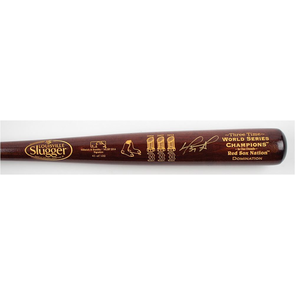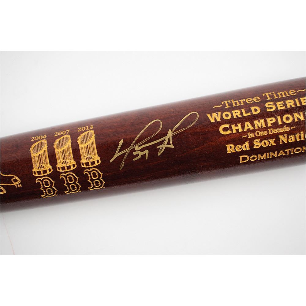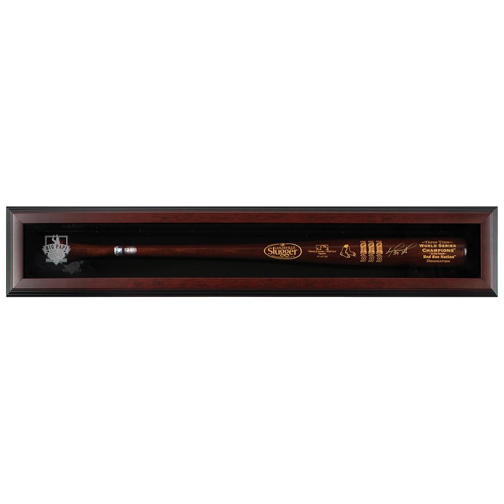 Official limited edition Louisville Slugger baseball bat laser-engraved to honor the World Series victories of the Boston Red Sox in 2004, 2007, and 2013, numbered 41/100, signed in gold ink on the barrel by playoff hero David Ortiz. In fine condition, with MLB holograms affixed to the handle. Accompanied by a shadowbox display case.