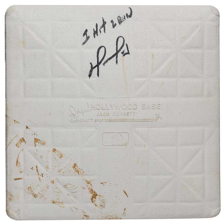Official Hollywood game-used third base from Yankee Stadium from the Septemer 10, 2005, game at Yankee Stadium, signed in black felt tip, “I Hit 2 Run, David Ortiz.” Accompanied by a certificate of authenticity from Steiner, as well as a letter from Yankees-Steiner Collectibles. In fine condition, with a footprint to base. Pre-certified Steve Grad/PSA/DNA and RRAuction COA.