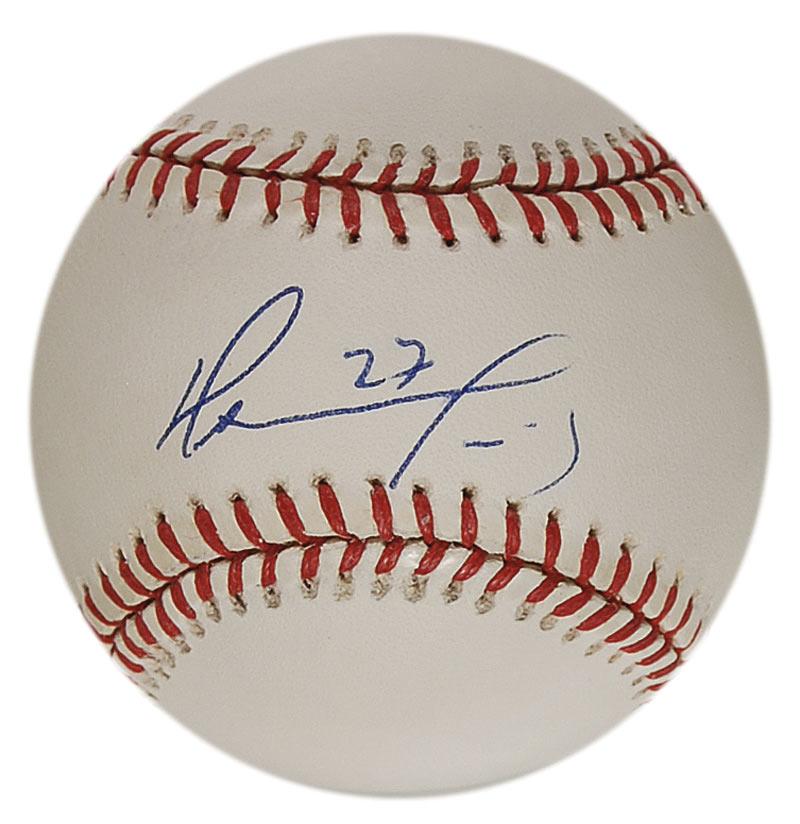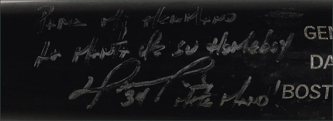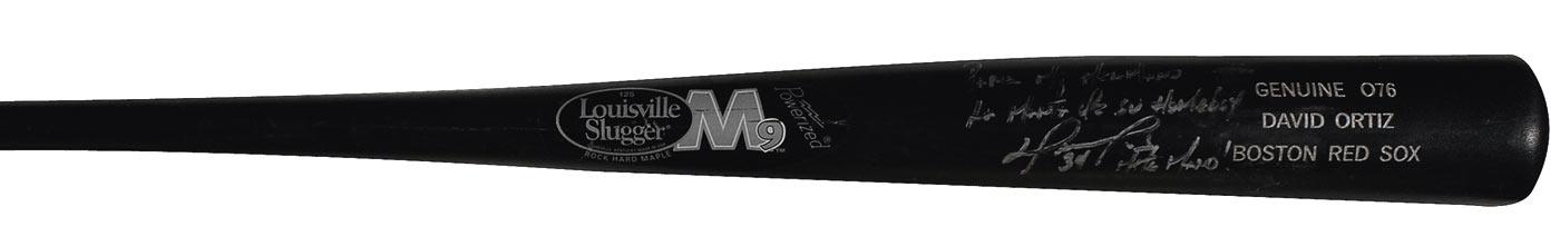 Two items: Official Louisville Slugger M9 game used bat from the 2004 season, signed “David Ortiz 34” in silver paint pen with a sentiment in Spanish; and an Official Rawlings American League baseball signed in blue ballpoint on the sweet spot. In overall fine condition.
