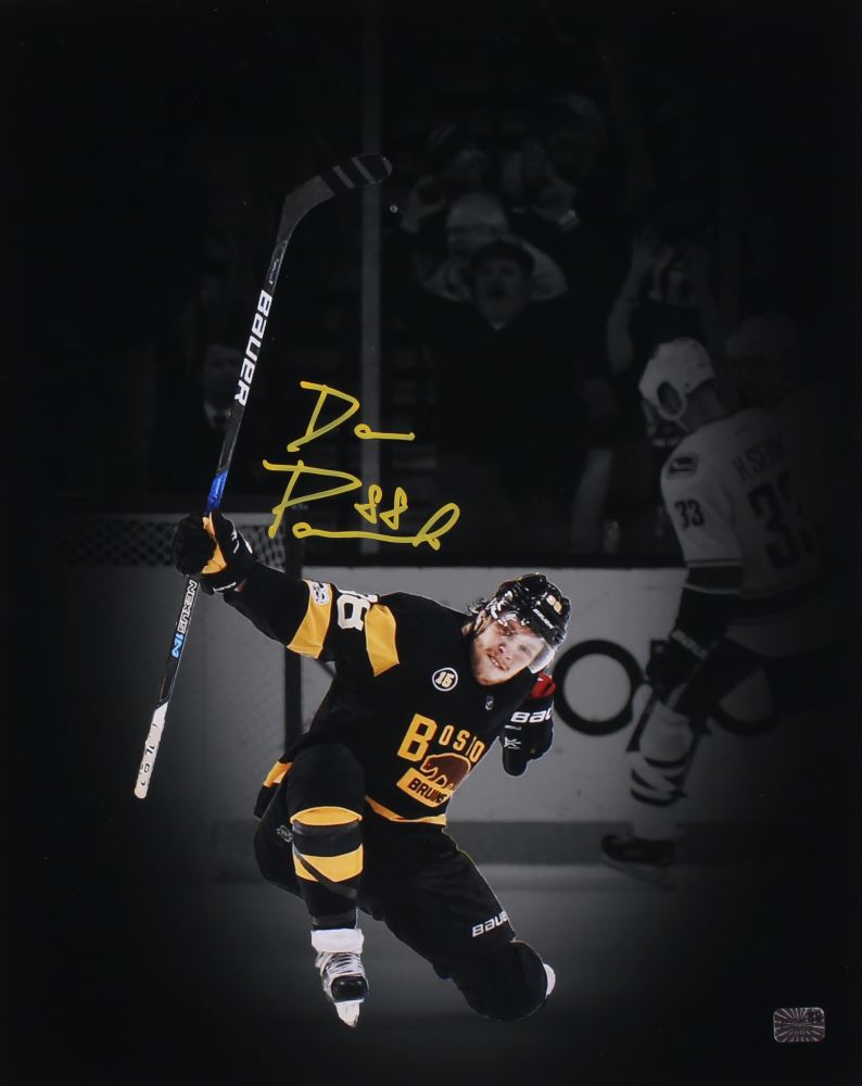 Photo measures 16" x 20" in size and is hand-signed in yellow paint pen by David Pastrnak.
