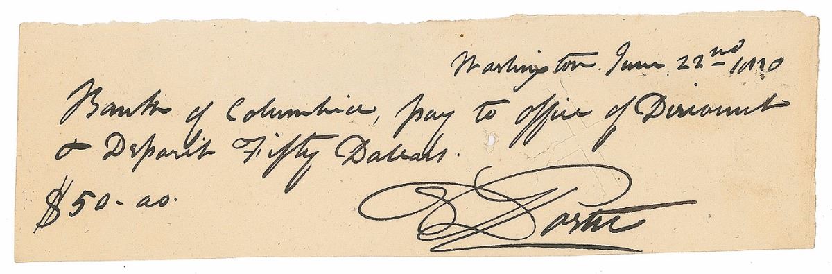 American naval officer (1780–1843) who led the first capture of a British vessel during the War of 1812 and who later served as commander-in-chief of the Mexican Navy. Autograph check, 8 x 2.25, filled out and signed by Porter, “D. Porter,” payable to the Office of Discount and Deposit for $50, June 22, 1820. In fine condition, with a small cancellation hole and cuts.