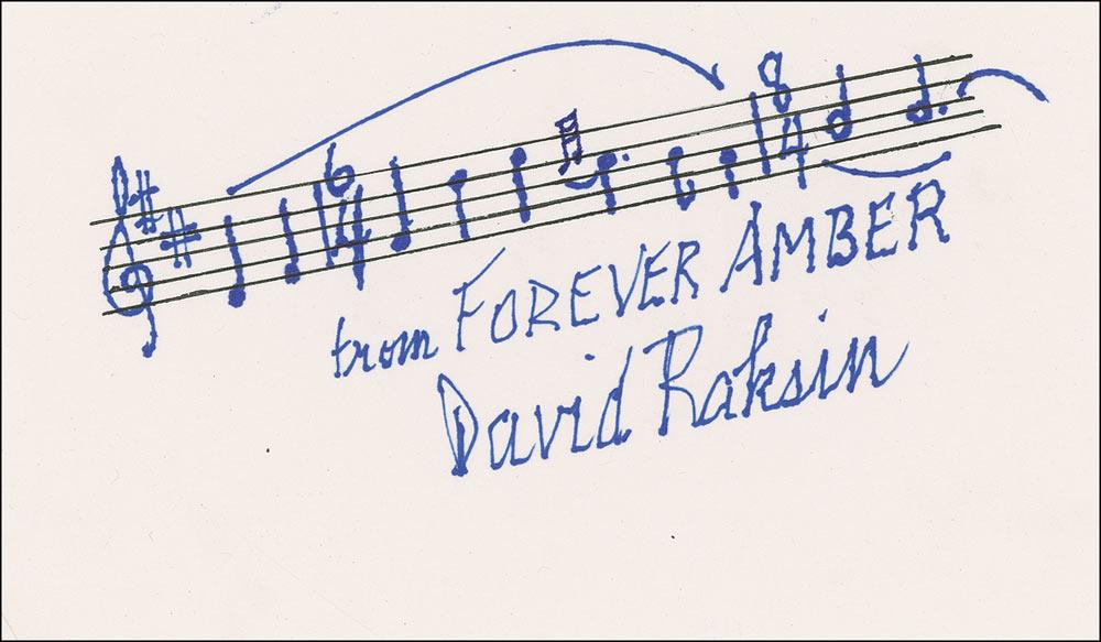 AMQS on a 6 x 3.5 off-white card. Raksin pens three bars of music from ‘Forever Amber’ signed “from FOREVER AMBER, David Raksin.” In fine condition.