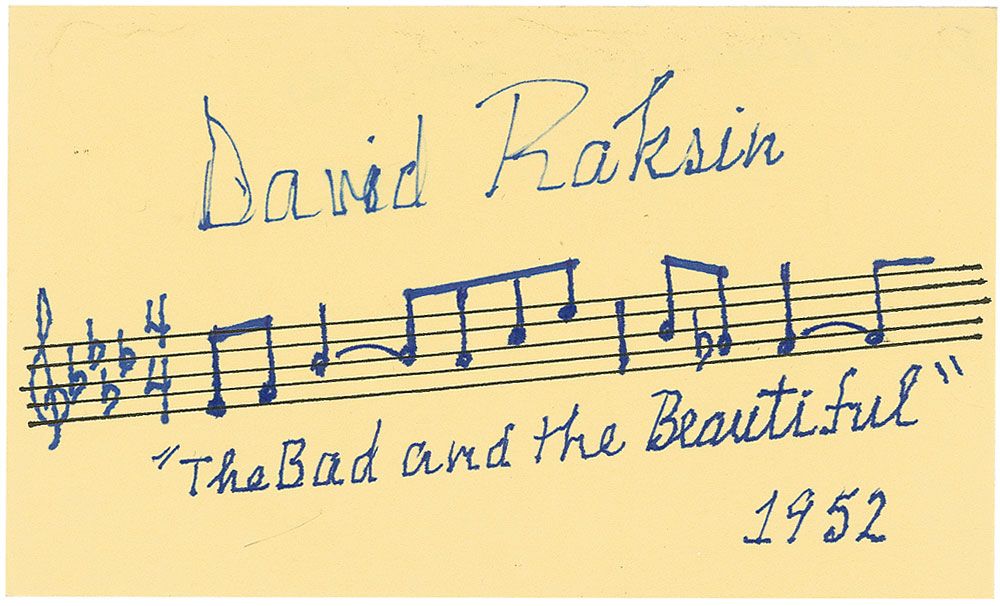 Composer (1912-2004) with over 100 film scores and 300 television scores to his credit, he became known as the ‘Grandfather of Film Music.’ AMQS on a yellow 5 x 3 card. Raskin pens two bars of music to ‘The Bad and the Beautiful,’ signing at the top, “David Raksin,” and dated 1952 in the lower right corner. In fine condition.