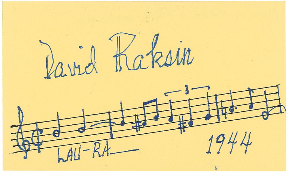 Composer (1912-2004) with over 100 film scores and 300 television scores to his credit, he became known as the ‘Grandfather of Film Music.’ AMQS on a yellow 5 x 3 card. Raksin pens two bars of music to ‘Laura,’ signing at the top, “David Raksin,” and dated 1944 in the lower right corner, the year of the film. In fine condition.