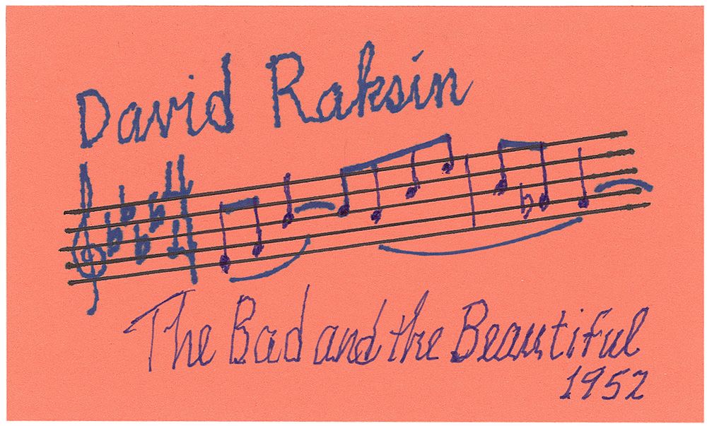 AMQS on a pink 5 x 3 card. Raksin pens two bars of the music to ‘The Bad and the Beautiful,’ signing at the top, “David Raksin,” and dated 1952 in the lower right. In fine condition.