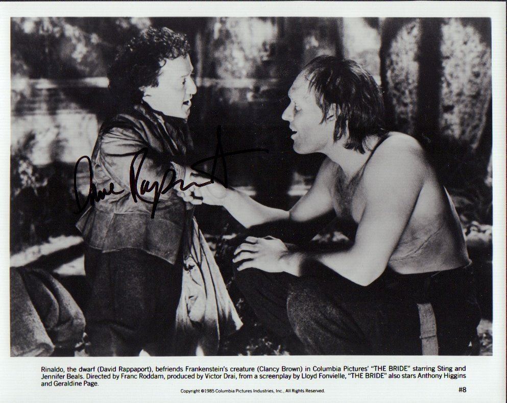 Black and white 8x10 photo from the film The Bride signed by David Rappaport. All items come with a certificate of authenticity good for the life of the piece.