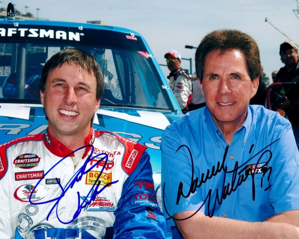 8" x 10" photo. Hand-signed in blue felt-tip pen by David Reutimann & hand signed in black felt-tip pen by Darrell Waltrip. The autograph includes an LOA and lifetime authenticity guarantee from Pristine Auction.