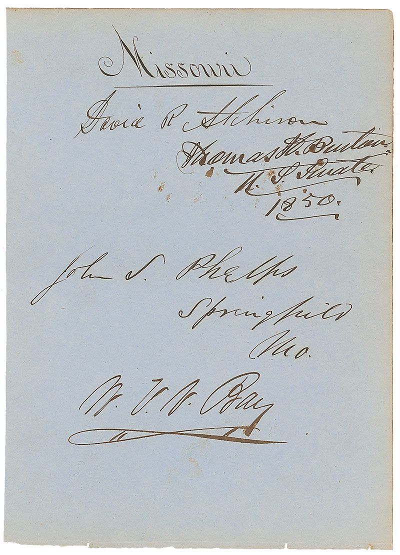 American politician (1807–1886) best remembered as the subject of a controversy over whether, as president pro tempore of the Senate, he technically served one day as US president in 1849 when Zachary Taylor declined to be inaugurated on the Sabbath. Though the unusual circumstances have since been widely analyzed and the notion of Atchison’s presidency discounted, the legend of his ‘tenure’ has become an enduring fixture of American political folklore. Ink signature, “David R. Atchison,” on a light blue 5.5 x 8 album page. Also signed by fellow Missouri congressmen Thomas H. Benton, John S. Phelps, and William V. Bay; another sheet of the same size is signed by Willard P. Hall, James S. Green, and James B. Bowlin. In fine condition.