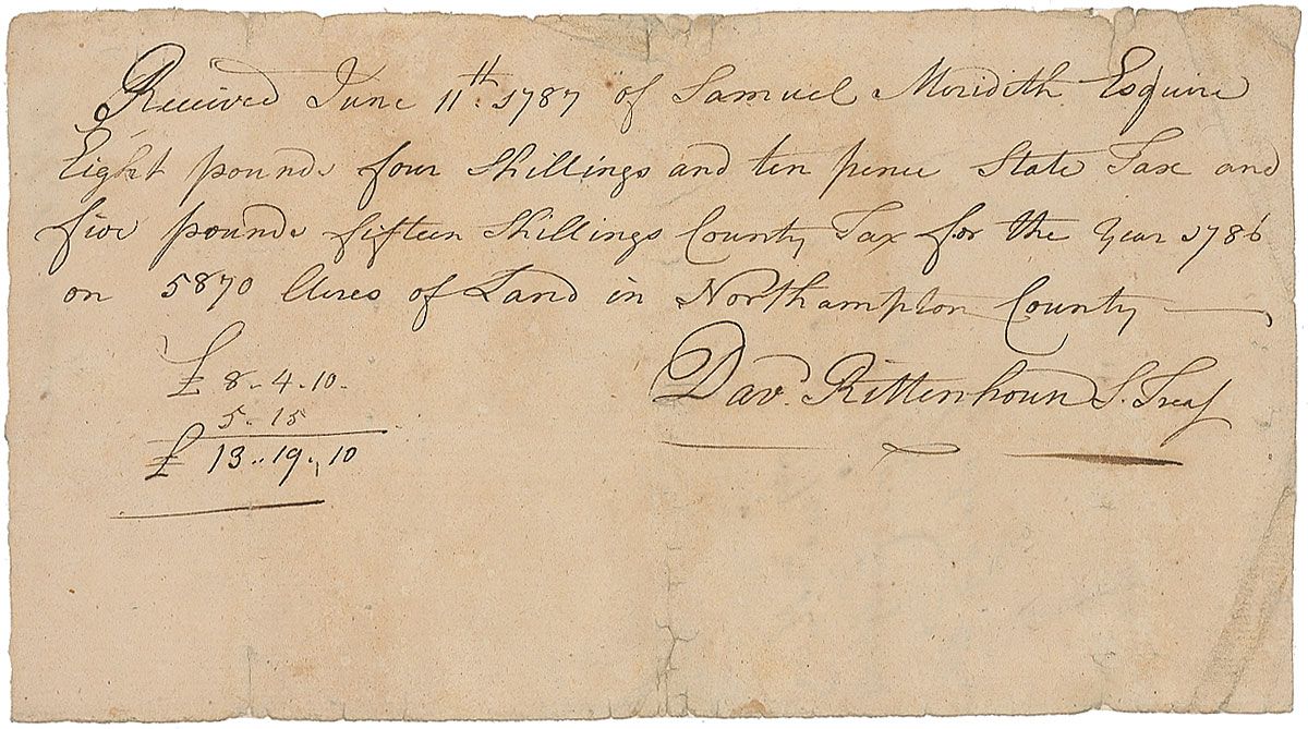 American astronomer and inventor (1732–1796) and the first director of the US Mint. Scarce ADS, signed “David Rittenhouse,” one page, 8.25 x 4.5, June 11, 1787. Receipt reads, in part: “received…of Samuel Meridith Esquire Eight Pounds four shillings and ten pence State Tax and…County Tax for the year of 1786 on 5870 acres of land in Northampton County.” In very good condition, with intersecting folds, a couple passing through single letters of signature, a couple small edge repairs, and scattered toning and soiling. The first one we have ever offered.