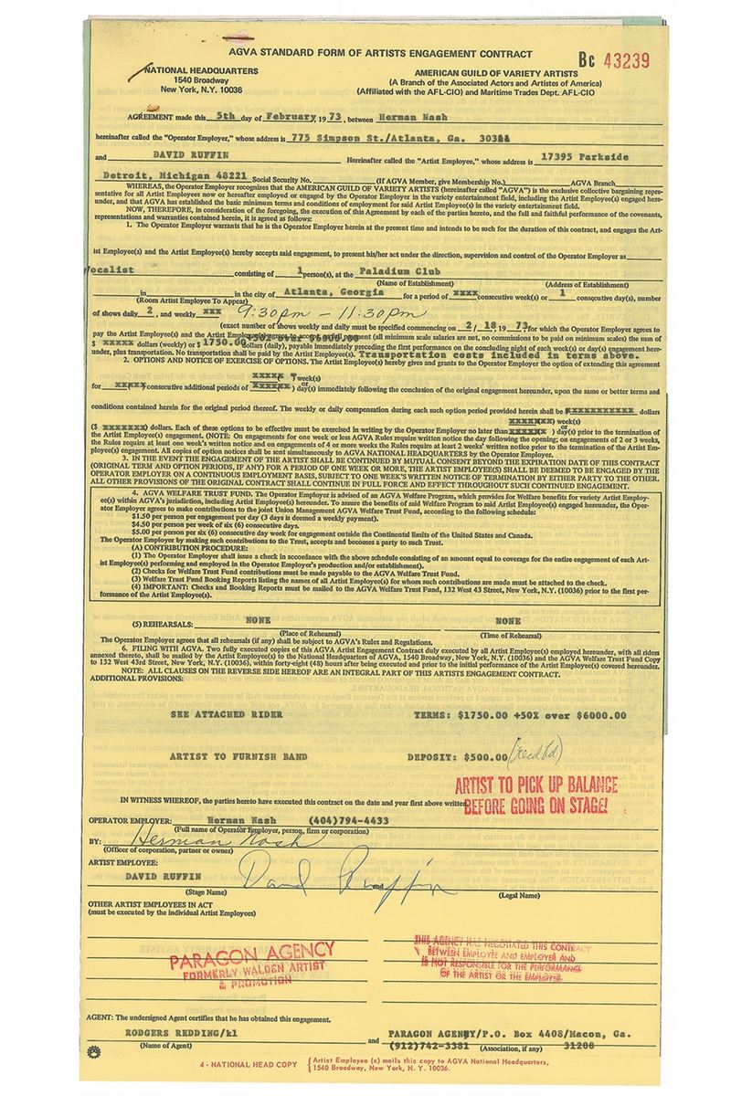 American soul singer and musician (1941–1991) most famous for his work as one of the lead singers of the Temptations. Set of two identical DSs, each one page, 9.25 x 17, February 5, 1973. Standard AGVA engagement contract between Ruffin and Herman Nash, in which the former agrees to “present his act…as a vocalist…at the Paladium Club in the city of Atlanta, Georgia,” on February 18, 1973, for a total sum of $1750. Both signed at the conclusion in blue ballpoint by Ruffin and countersigned by Nash. Documents are stapled together at the top, with attached riders additionally signed by Ruffin. Documents are stapled together at the top. In fine condition, with expected document wear, and slight soiling and creasing. From the archives of agent and founder of Capricorn records Phil Walden.