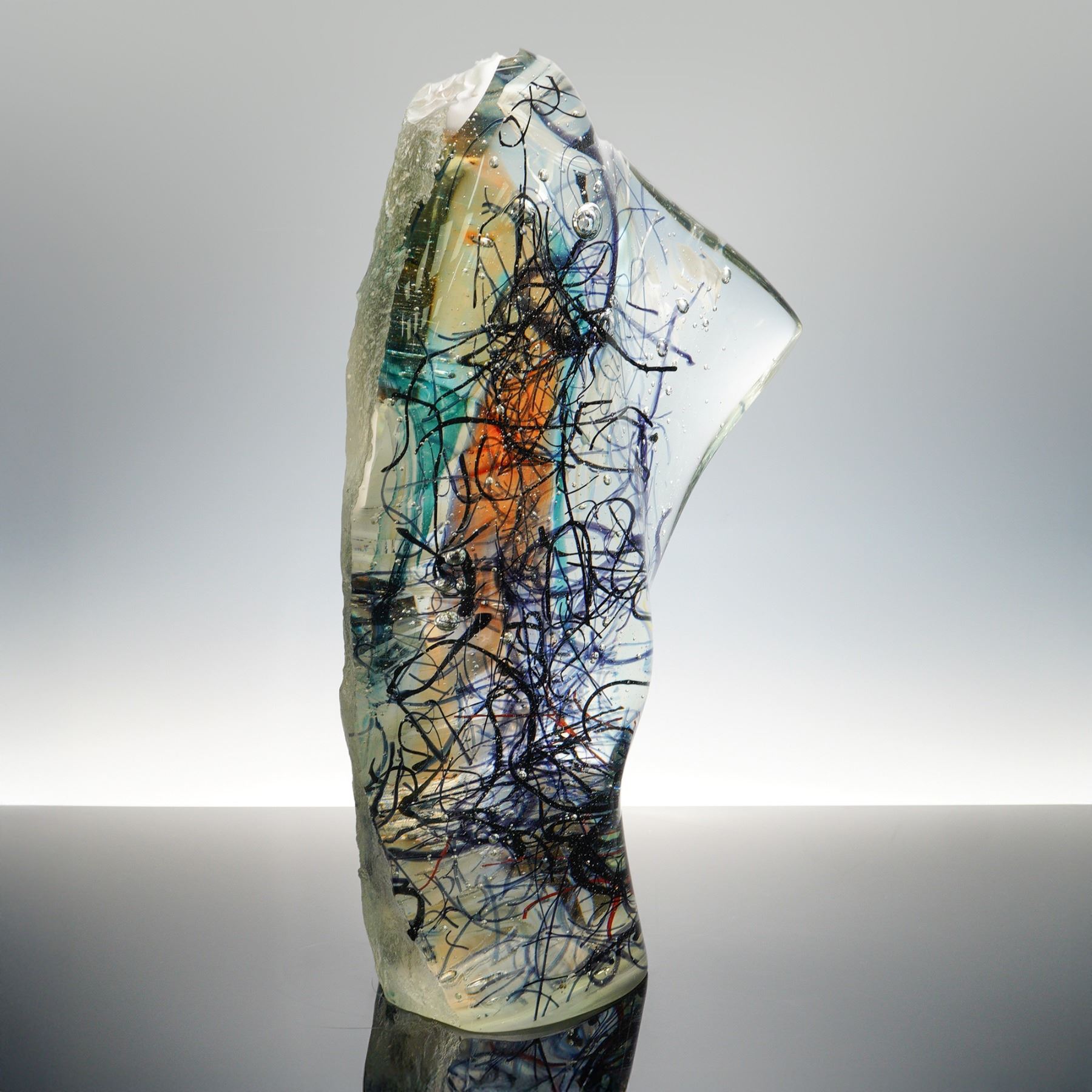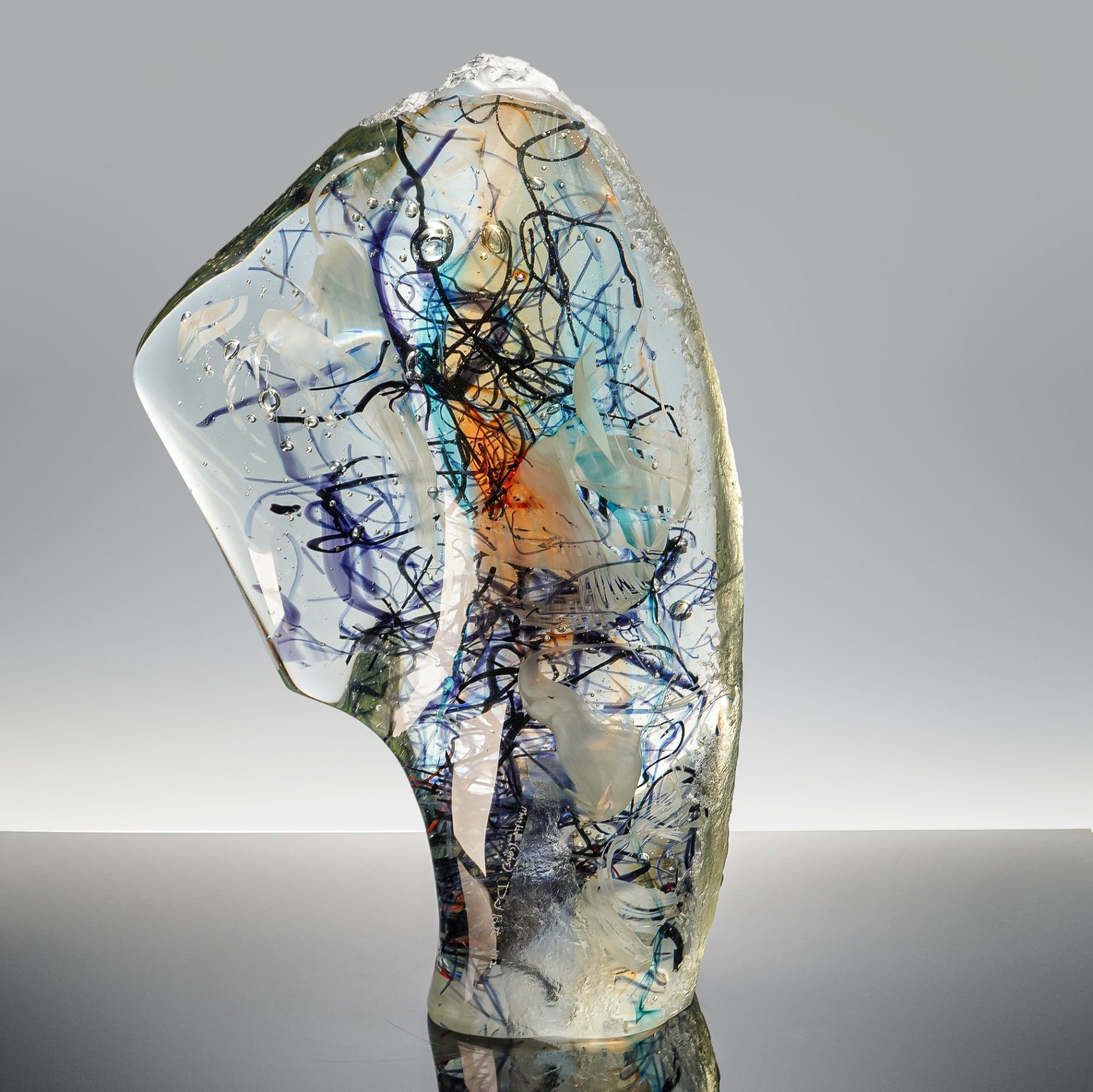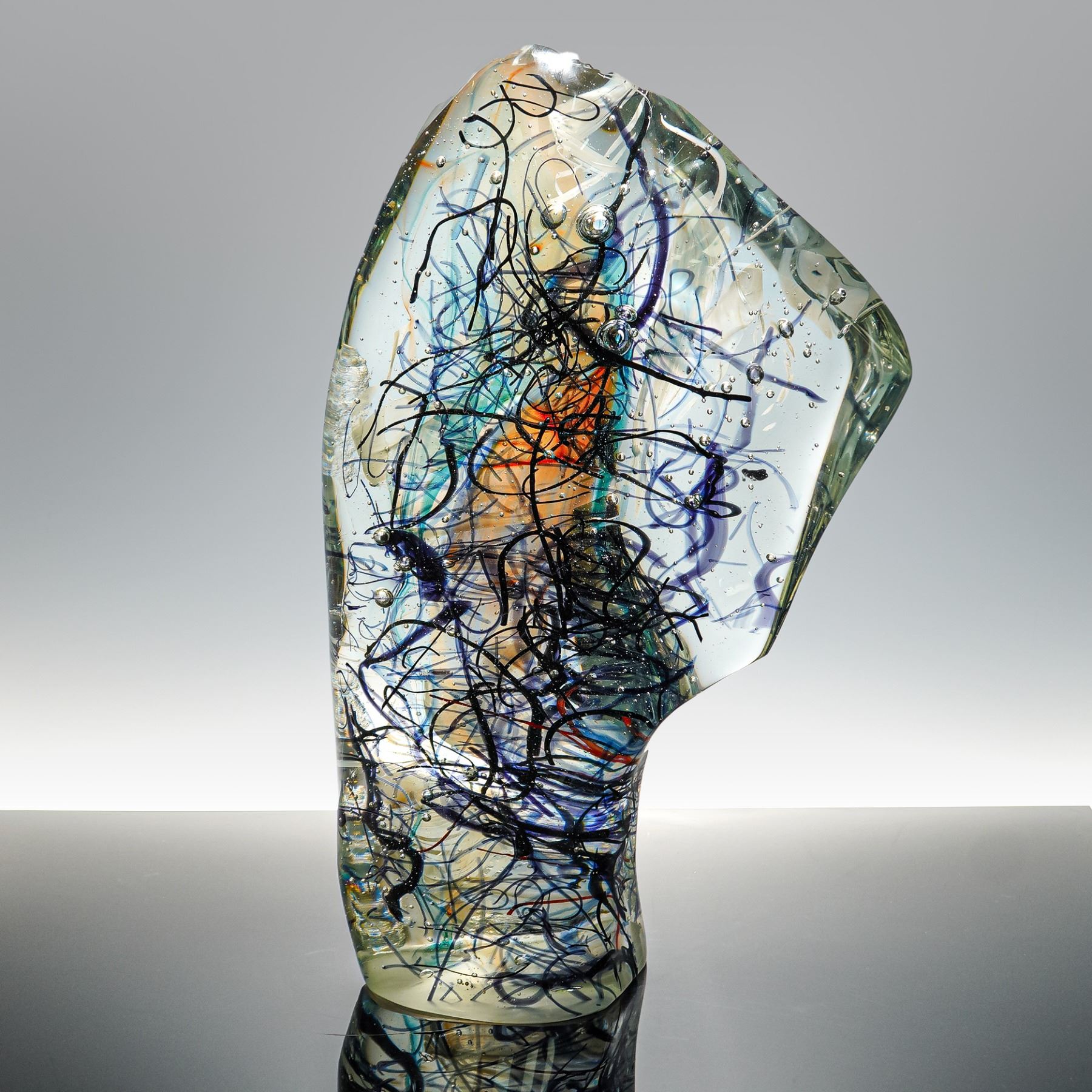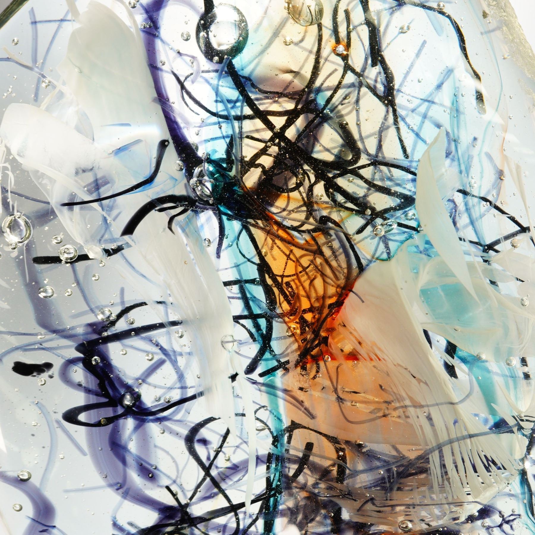 An intriguing and sophisticated studio art glass sculpture, inscribed "Menkar (Cetus) David Ruth," combining celestial reference with expressive glass technique. The piece showcases intricate internal color trails - cobalt, black, orange, turquoise - suspended within a clear, asymmetric glass form. The surfaces alternate between smooth polished planes and subtly textured or raw edges, creating interplay of light, shadow, and internal depth. The inscription suggests a poetic or mythic naming: Menkar refers to the star Menkar (Alpha Ceti) in the constellation Cetus, anchoring the work in an astral motif. This one of a kind sculpture invites both aesthetic admiration and interpretive intrigue, blending craft and symbolic reference. Ideal for collectors of studio glass, contemporary sculpture, or celestial-themed art.