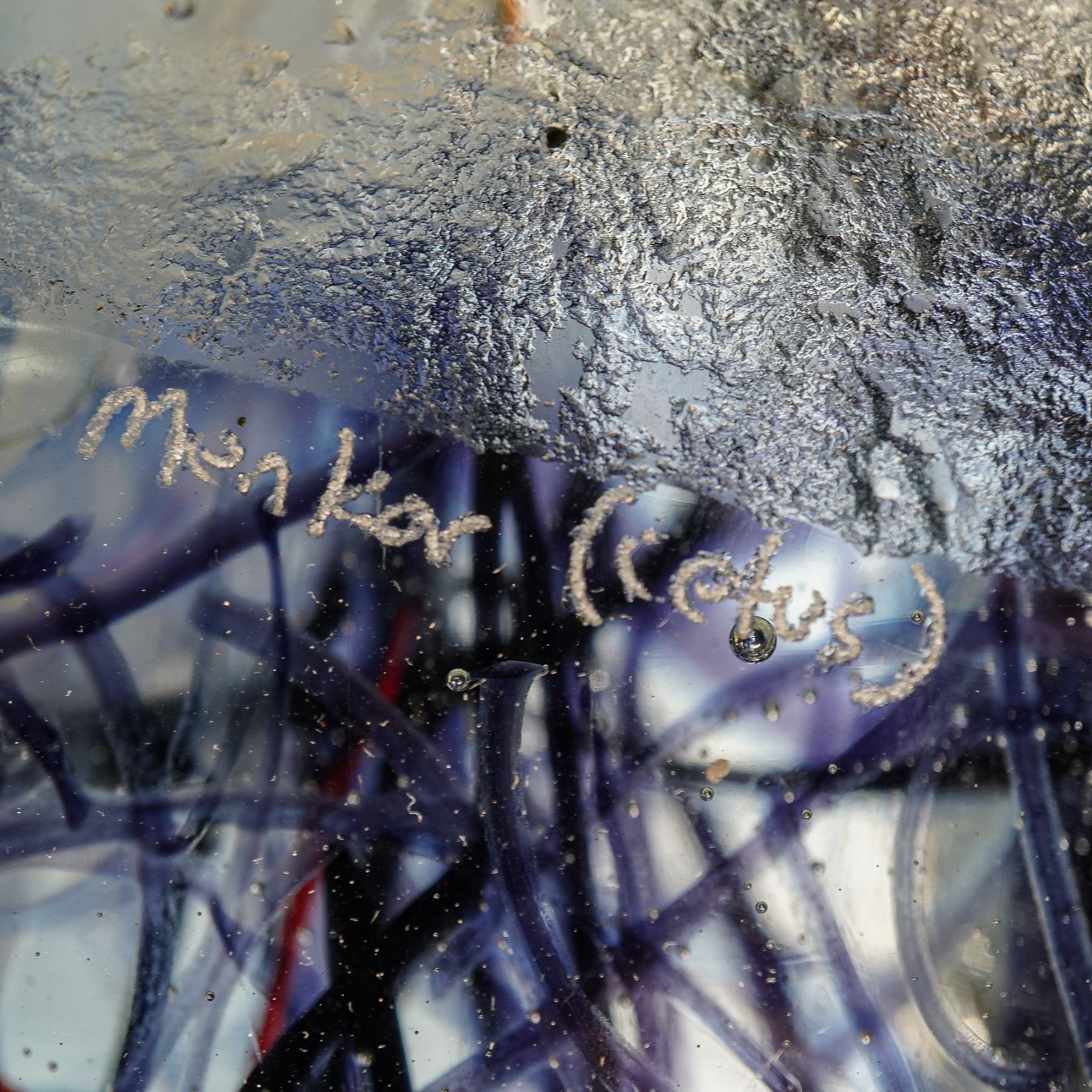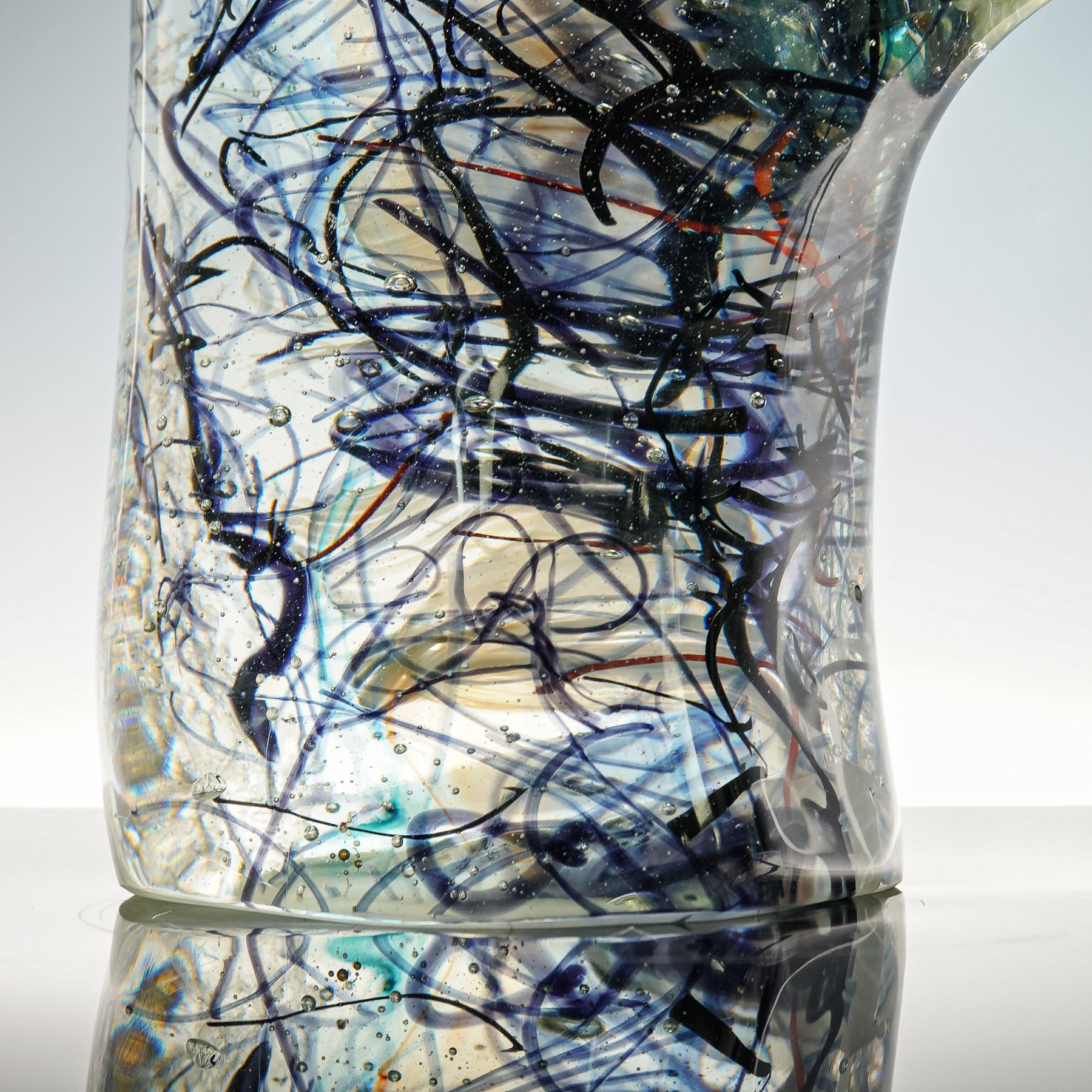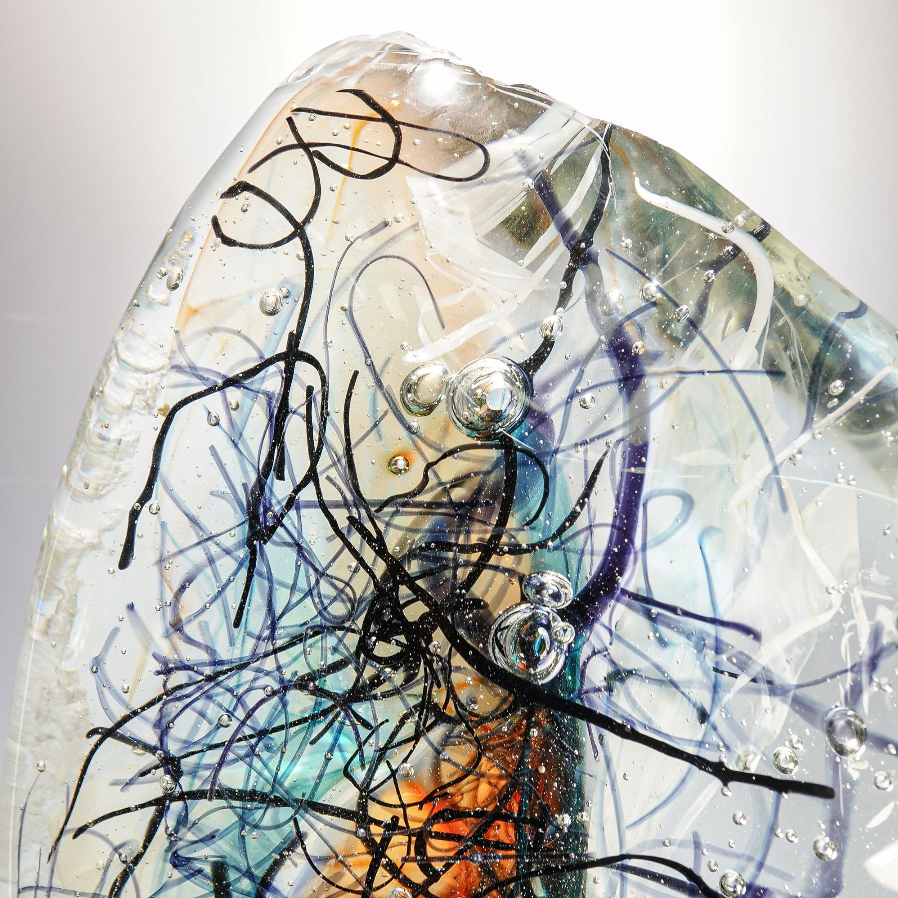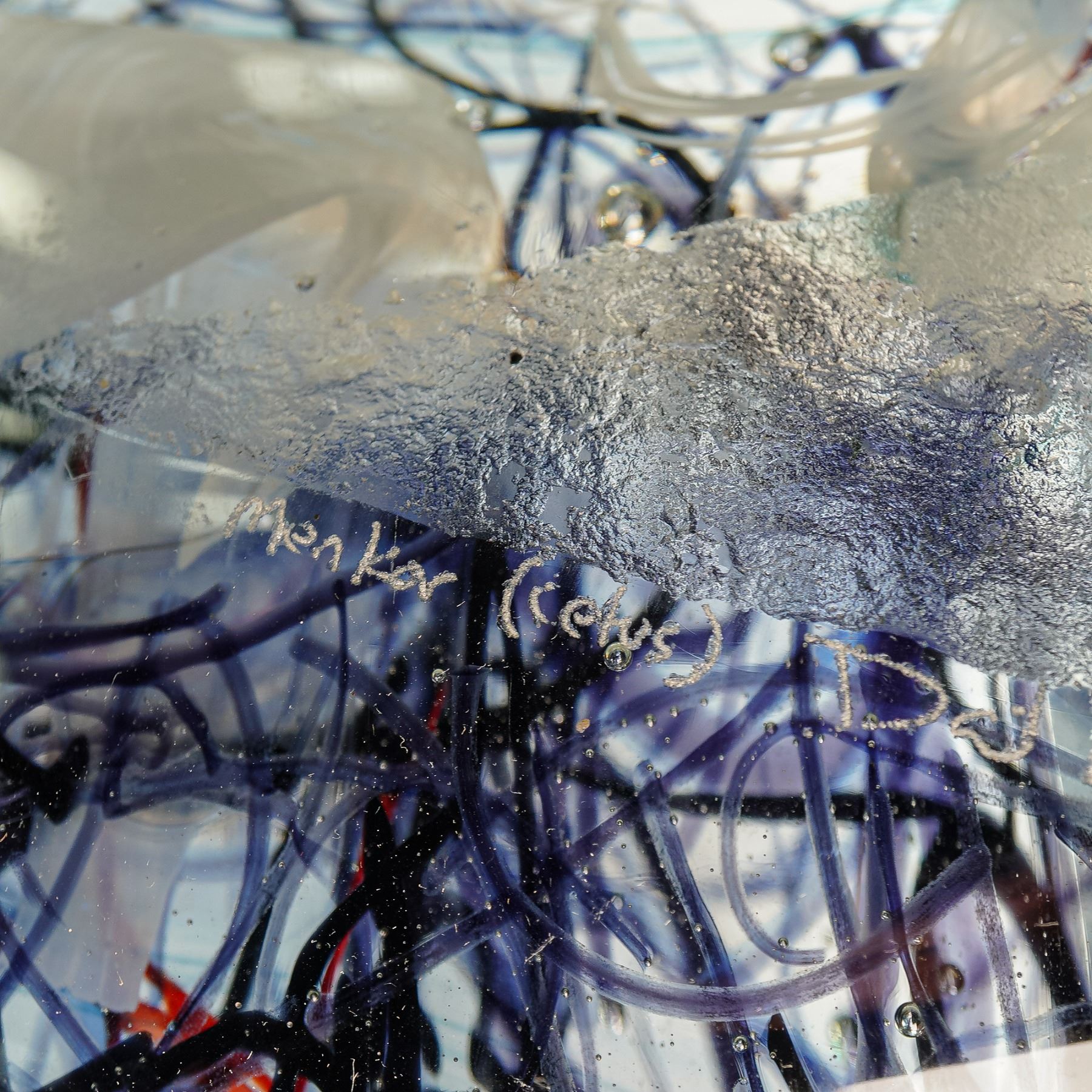 An intriguing and sophisticated studio art glass sculpture, inscribed "Menkar (Cetus) David Ruth," combining celestial reference with expressive glass technique. The piece showcases intricate internal color trails - cobalt, black, orange, turquoise - suspended within a clear, asymmetric glass form. The surfaces alternate between smooth polished planes and subtly textured or raw edges, creating interplay of light, shadow, and internal depth. The inscription suggests a poetic or mythic naming: Menkar refers to the star Menkar (Alpha Ceti) in the constellation Cetus, anchoring the work in an astral motif. This one of a kind sculpture invites both aesthetic admiration and interpretive intrigue, blending craft and symbolic reference. Ideal for collectors of studio glass, contemporary sculpture, or celestial-themed art.