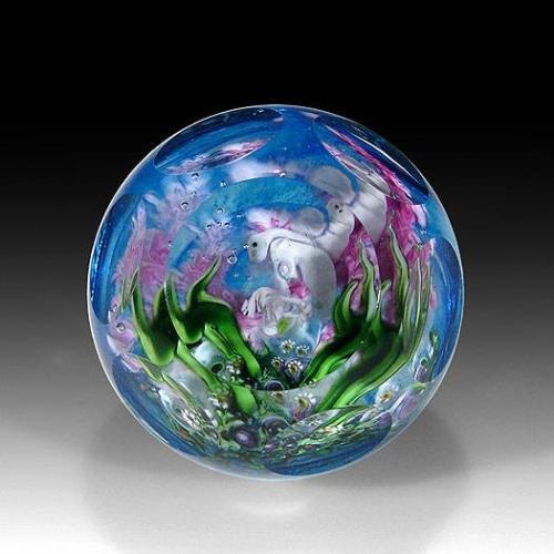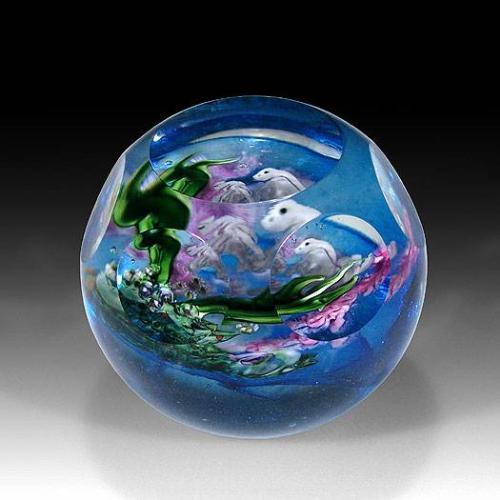 David Salazar 1998 paperweight with gray manatees, coral, shells and seaweed on translucent blue ground. Six and one facets. Signed/dated. Diameter 2 1/4".