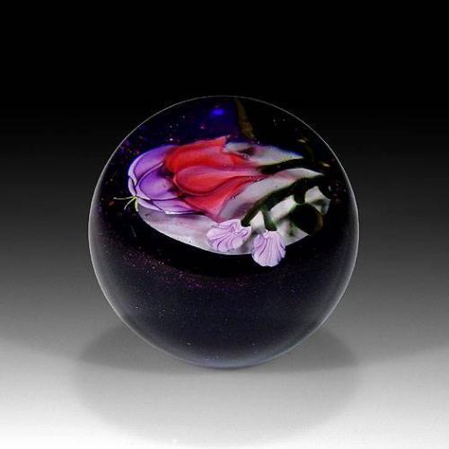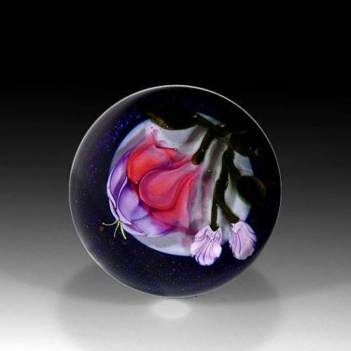 David Salazar 2000 "Darling Fuchsia" flower and moon paperweight. The piece contains a pink and amethyst fuchsia flower, against a full moon, in an iridescent blue night sky. Signed/dated. Diameter 2 1/8".