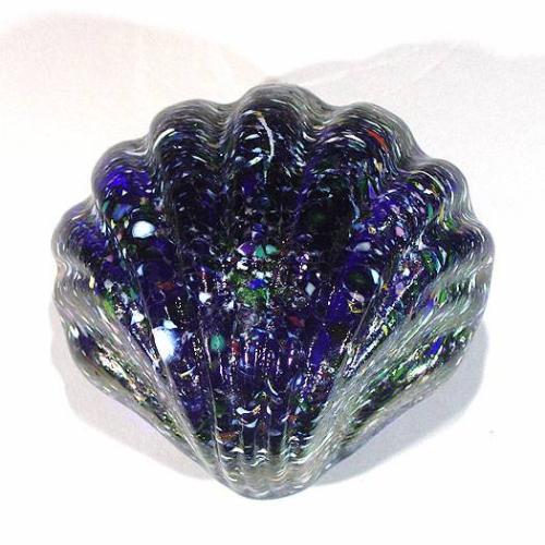 David Salazar Art Glass 2000 "Paradise Shell" paperweight. One side of the piece resembles an opaque, iridescent, blue, ridged shell. The opposite side has an interior design depicting a tropical island in a blue sea, which is visible through a circular window facet. Signed/dated. Width 3 1/4".