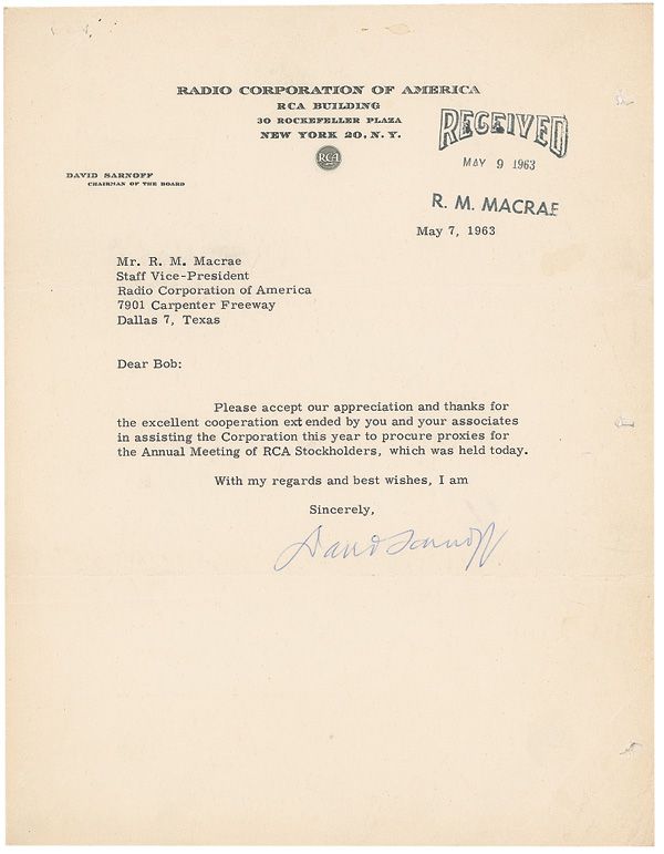 Led two other operators at the Wanamaker station in a 72-hour marathon in an effort to confirm the fate of the Titanic. He went on to become president of RCA. TLS, one page, 8.5 x 11, Radio Corporation of America letterhead, May 7, 1963. Letter to the Staff Vice President of RCA. In full, “Please accept our appreciation and thanks for the excellent cooperation extended by you and your associates in assisting the Corporation this year to procure proxies for the Annual Meeting of RCA Stockholders, which was held today.” In fine condition, with three punch holes to right edge, staple holes to top left corner and light toning.