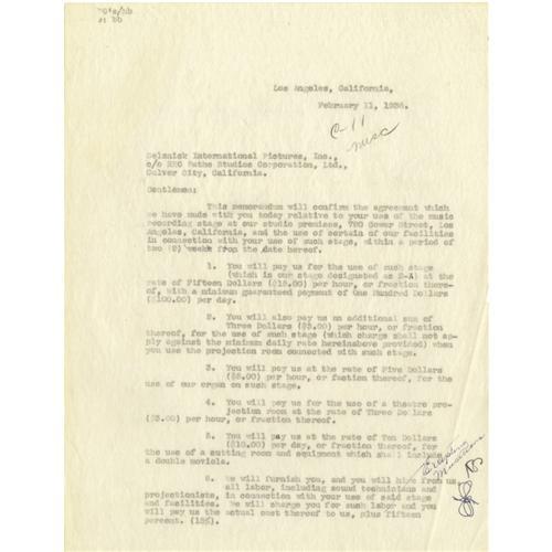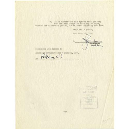 <B>David Selznick Signed Contract.</B></I> This two-page document, dated February 11, 1936, bears the signature of one of Hollywood's all-time great producers, David O. Selznick. After achieving distinction at RKO and MGM, Selznick boldly set up his own independent studio, Selznick International Pictures, Inc. This letter refers to that daring challenge, as Selznick, needing production facilities, signs to lease the music recording stage at RKO Studios. The first page is initialed by Selznick "DOS" regarding a change in the contract, and the second page of the document is signed by an RKO executive, while Selznick had added his rather loopy signature in black ink to the line below "Confirmed and Agreed to: Selznick International Pictures Inc." The letter has some annotation in ink and pencil, and is stamped "Received Feb 6 1946 Legal Filing Dept.," obviously added to the files long after its original drafting. A crease on the lower right border of both pages does not affect the signatures or the overall impact. Selznick's studio would later produce such classics as <I>The Prisoner of Zenda,</B></I> <I>A Star Is Born,</B></I> and, of course, <I>Gone With the Wind.</B></I> Indeed, it was only a few months after this contract was drawn that Selznick's associate Kay Brown contacted him about her enthusiasm for the novel <I>Gone With the Wind,</B></I> published in May of 1936. In Very Fine condition.<BR><BR><b>Shipping:</b> Flat Material, Small (<a target="_blank" href="http://www.heritageauctions.com/common/shipping.php">view shipping information</a>) <BR><BR><B>Important notice:</